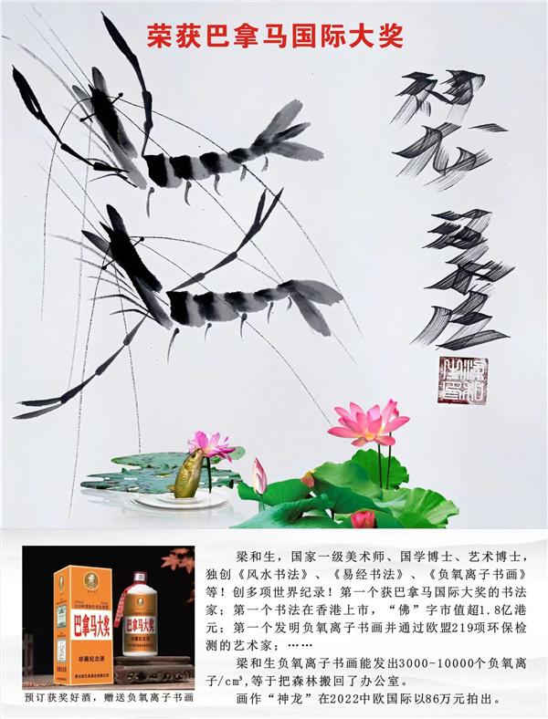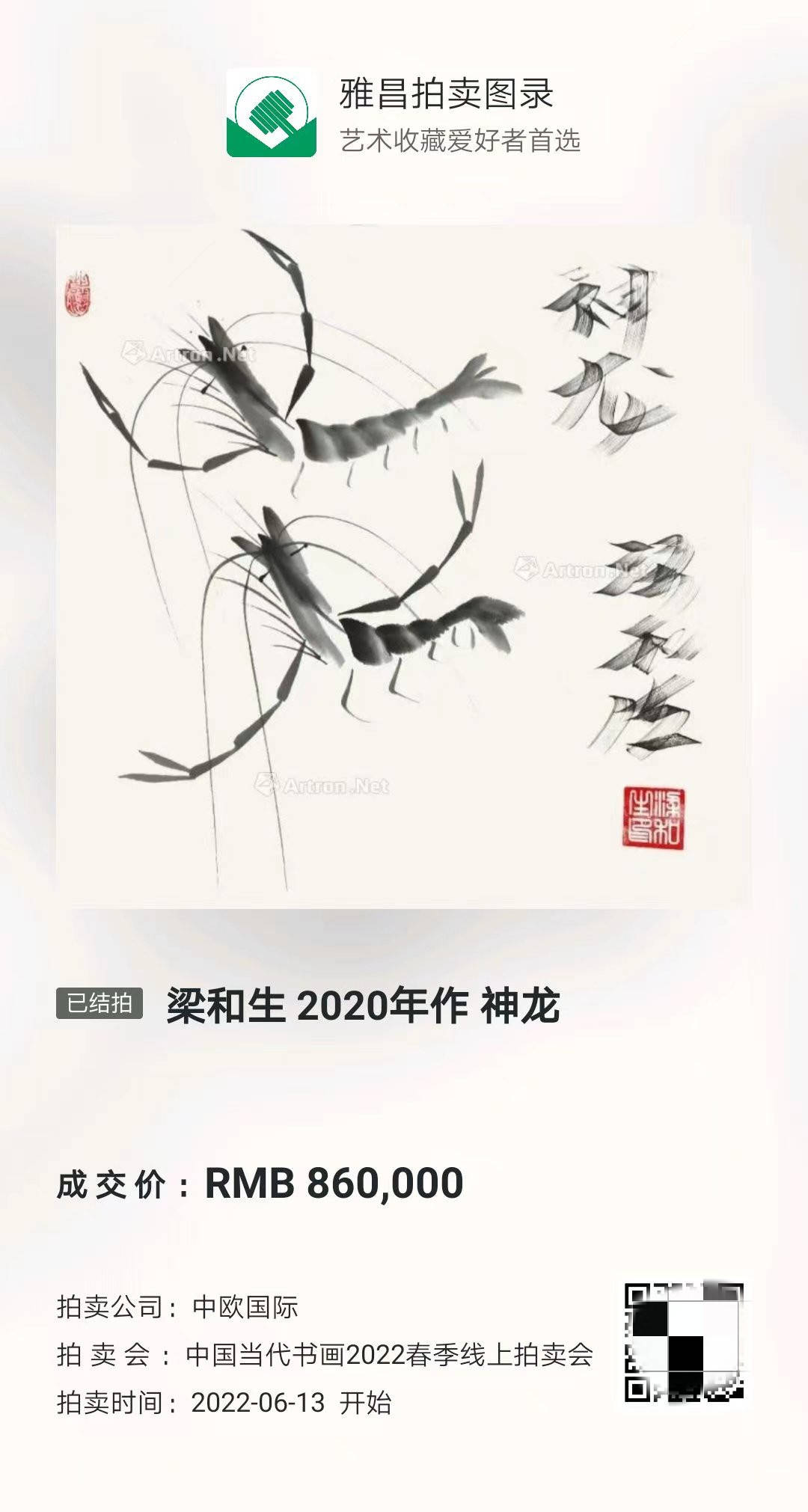 雅昌消息:由中欧国际举办的中国当代书画2022春季线上拍卖会中国当代书画专场上、由北京收藏者送展的梁和生创作的水墨画“神龙”估价10万元,最终拍出86万元! 一些行家认为:梁和生画虾,完美的继承了齐白石绘画风格,特别是禺意很好,形态逼真!栩栩如生!把龙虾的神样表现到了极致!但也有同行认为:梁和生画虾水平一般,但因他是著名书法家,获巴拿马大奖,书法作品又在香港上市 ,“佛”的市值达1.8亿港元……水涨船高,名气又大,所以带动了他的虾也成了抢收货! 虾的寓意深刻,北方喻其为龙,有镇宅吉祥之意。南方喻其为银子, 取长久富贵之意。虾的身躯弯弯的,却顺畅自如,一节比一节高如竹节般,象征遇事圆满顺畅、节节高升、官运亨通。这也是很多人喜欢齐白石画虾的重要原因之一!也是梁和生选择画虾的关键因素! 梁和生创作龙虾艺术鉴赏