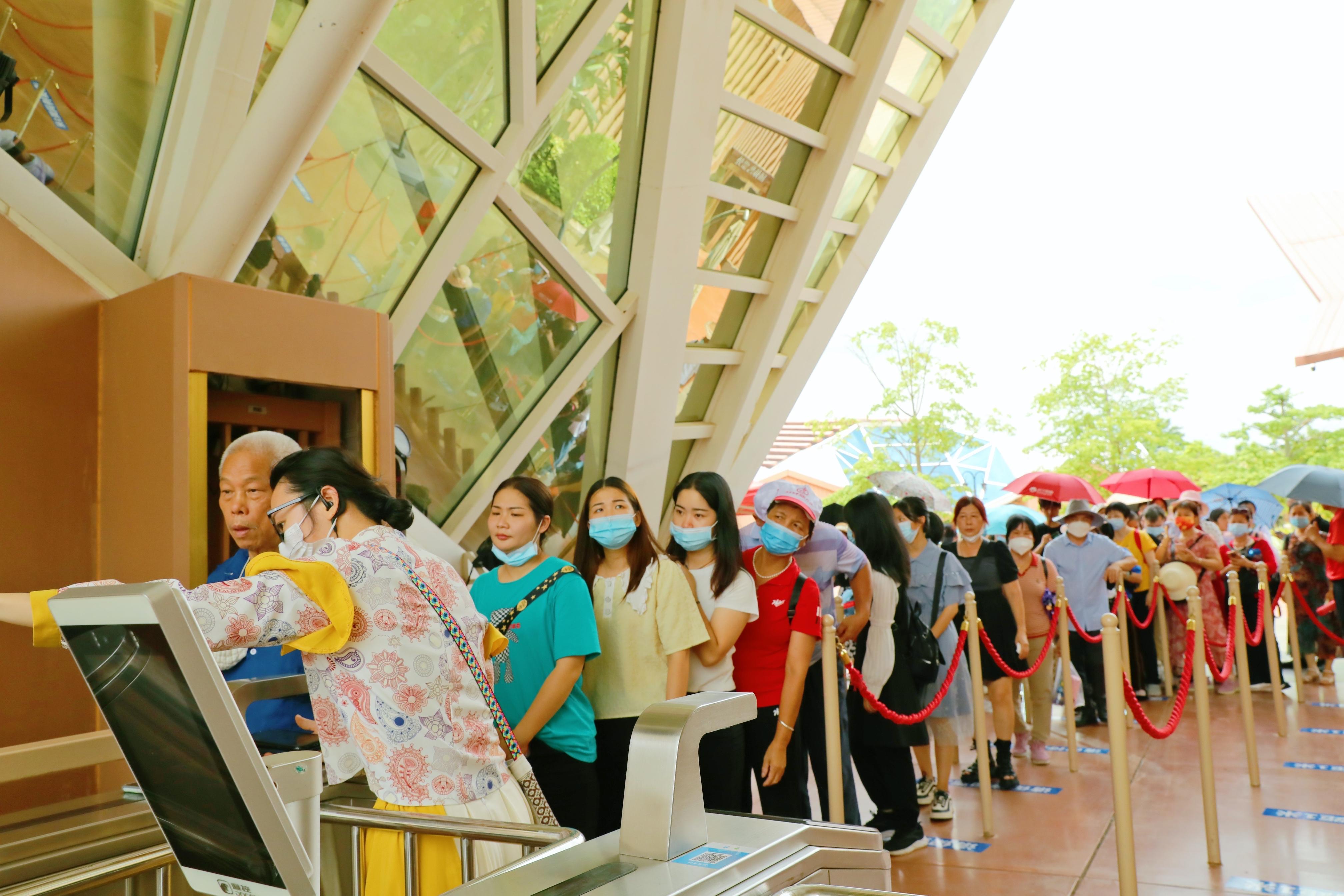 游客们等候入园,开启“一日玩遍东南亚”的奇妙旅程。刚刚还沉浸在《伴你飞翔》你凌空飞跃东盟十国的震撼美景,转眼间就来到《千岛之歌》,领略真人歌舞与魔球演绎的印尼风情大秀。一个个大受好评的经典项目,将各国历史文化与顶尖科技巧妙融合,展开一幅独具魅力的东南亚风土人情画卷。《梦幻转马》、《极地快车》、《丛林飞龙》等室外项目,让不同年龄层的游客,收获了青春活力与美好心情,口罩难掩明媚笑容。