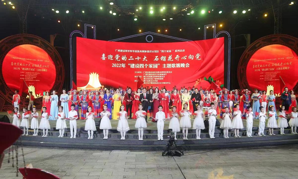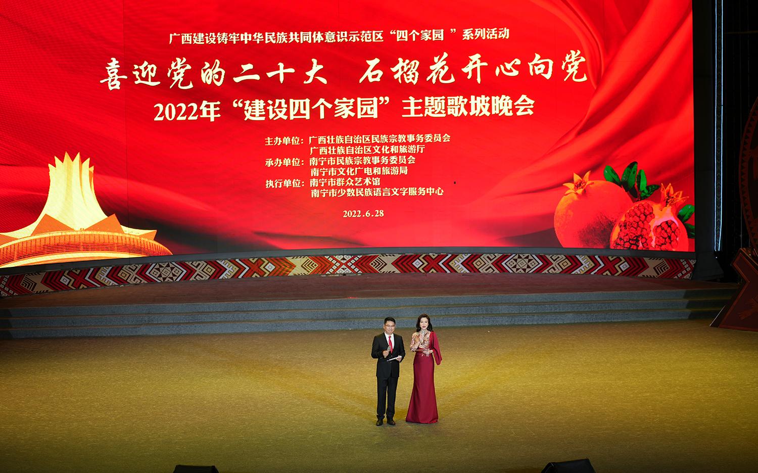 6月28日晚,广西建设铸牢中华民族共同体意识示范区“四个家园”系列活动——“喜迎党的二十大 石榴花开心向党”2022年“建设四个家园”主题歌坡晚会在南宁民歌湖大舞台隆重举行,上演了一场集中展示广西壮族自治区各民族优秀传统文化的视听盛宴。晚会由广西壮族自治区民族宗教事务委员会、广西壮族自治区文化和旅游厅主办,南宁市民族宗教事务委员会、南宁市文化广电和旅游局承办,南宁市群众艺术馆、南宁市少数民族语言文字服务中心执行。