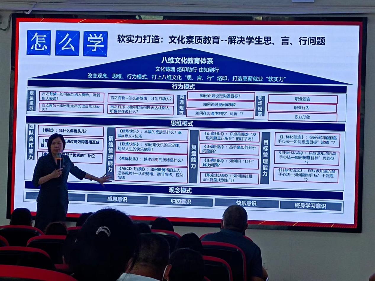 八维集团的陈院长现场在向怀化等地来校考察团讲解八维新型职业教育 学生来校后可以根据自己的兴趣爱好,进行专业的选择。学生入学后,八维教育会根据学生自身情况,从基础教起,确保学生学好学会。 颁发国家承认学历,学有所成