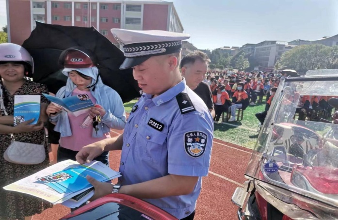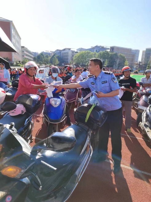 随后,山门交警中队中队长肖宏阳以及指导员李开雄向师生们赠送头盔,向同学们发放了交通安全宣传手册,同时要求学生把学到的交通安全知识带回家,监督家长自觉遵守交通法规,通过“小手拉大手”的形式,达到共同增强安全意识,减少和避免交通事故的目的。
