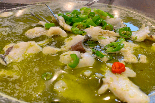“诱惑松鱼”,麻麻的味道中带着青椒的椒香味,使这道菜给人最初的印象,雪白的鱼片入口嫩滑。陈军委介绍,这道菜的做法是,将松鱼杀净,鱼身打片,鱼骨和鱼头斩成块,鱼片上浆。鱼骨和鱼头洗净入锅放入盐,科酒,姜片,葱头烹4分钟。另起锅把上浆的鱼片用90度的水烫熟捞出。起锅加入青椒汁烧开水,放入底料,鱼骨,再放鱼片,锅中加油放入二蒜条,滕椒烧热淋入盘中即可上菜。