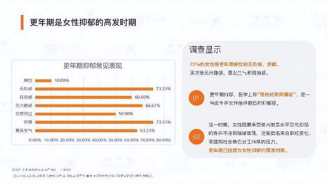 更年期也是女性抑郁的高发时期。这一时期,女性面临着来着子女、家庭和社会等多方的压力,她们的抑郁发作常伴随着“无助”、“孤独”、“烦躁”、“莫名生气”等多种不良情绪。