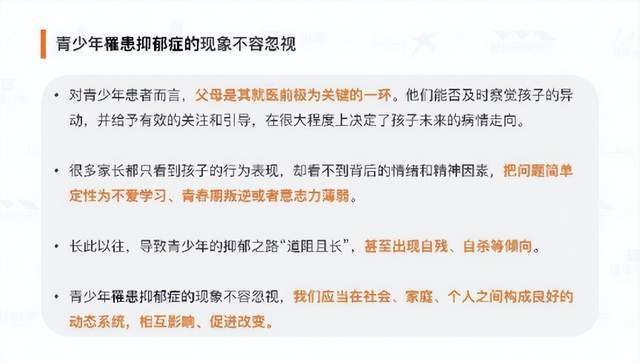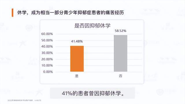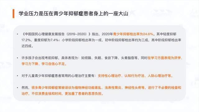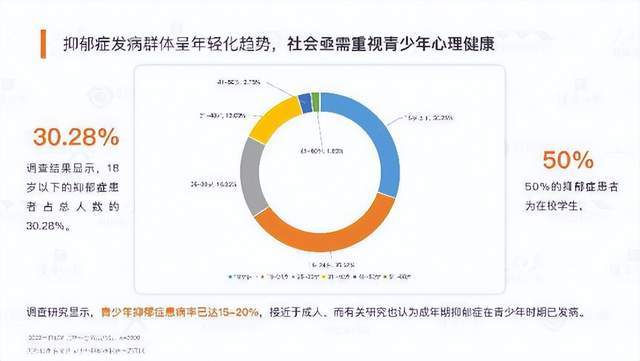 近年来,抑郁症发病群体呈年轻化趋势。青少年抑郁症患病率已达15%~20%,青少年的心理健康亟需社会重视。在抑郁症患者群体中,50%的抑郁症患者为在校学生,41%曾因抑郁休学,学业压力已经成为压在青少年抑郁症患者身上的一座大山。