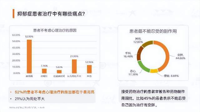 当下,抑郁症患者治疗中仍然存在诸多痛点。“费用高”成为阻挡患者长期接受心理治疗的“拦路虎”。在接受药物治疗的患者中,“变胖”、“恶心”、“手抖”、“便秘”等副作用是患者高度关注的问题。 抑郁症的治疗并非一蹴而就,据调研结果显示,近72%的人存在着复发现象,而服药依从性差是导致疾病复发的首要原因。