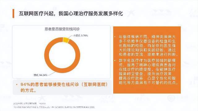 随着互联网医疗的兴起,我国心理治疗服务发展呈现多样化趋势。互联网医疗在破除医疗服务时空壁垒、提升治疗效果、提高诊疗效率、凸显个性化和智能化等方面具有不可替代的优点,提高了精神心理疾病患者对在线诊疗的接受度。据2022年好心情平台调研数据显示,94%的患者能够接受线上互联网医院问诊。