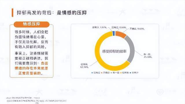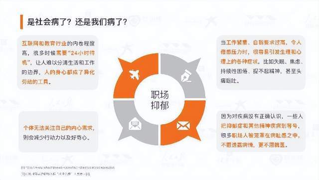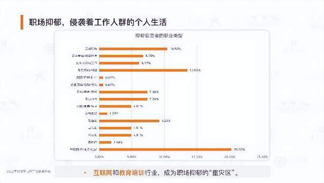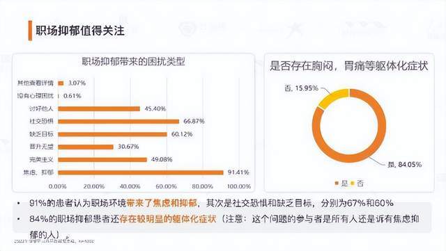 近年来,职场抑郁不断侵袭着职场打工人,职场抑郁同样值得我们关注。在众多职业中,互联网以及教育培训行业已成为抑郁症“重灾区”。 91%的患者认为,职场环境为工作者带来了焦虑和抑郁,不仅如此,还引发了一系列“社交恐惧”、“缺乏目标”等不良情绪。同时,84%的职场抑郁患者还存在明显的躯体化症状。