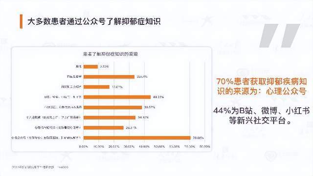 信息时代,患者了解抑郁症知识的渠道更加广泛,如70%通过心理类的微信公众号(如好心情互联网医院),44%通过B站、微博、小红书等新兴社交平台。