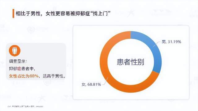 从性别视角出发,女性更容易被抑郁症“找上门”,其抑郁占比高达68%。相比男性,女性通常面临着更复杂的心理问题。