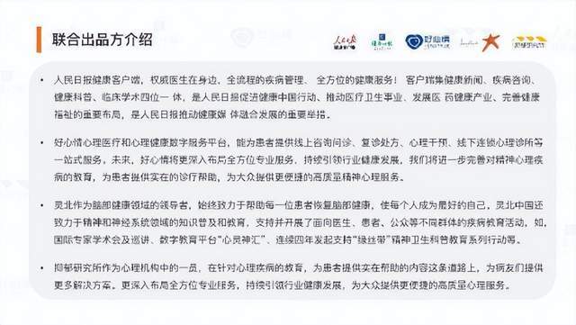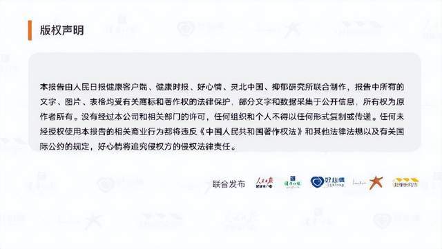 抑郁症是一种全世界都为之困扰的疾病,据世界卫生组织数据显示,全球抑郁症患者高达3.22亿。据最新的流行病学调查数据估算,我国抑郁症患者将近5000万,新冠疫情后,抑郁症的患病人数更是大幅增加。但事实上,国民对于抑郁症的了解还知之甚少,错误的认知是阻碍患者诊疗的最大障碍。正确认识和理解抑郁症,是你我和社会要共同迈出的关键一步。 为此,人民日报健康客户端、健康时报联合好心情心理医疗和心理健康数字服务平台、灵北中国及抑郁研究所,共同打造《2022国民抑郁症蓝皮书》,从国民抑郁症现状、抑郁症患者现状、患者就医现状、患者用药现状以及预防与干预等5个方面客观、全面反映我国抑郁症全貌及变化,呼吁国民高度重视心理健康,并探讨更有效果、更有效率的全新诊疗模式,从而打好抑郁症这场战役。