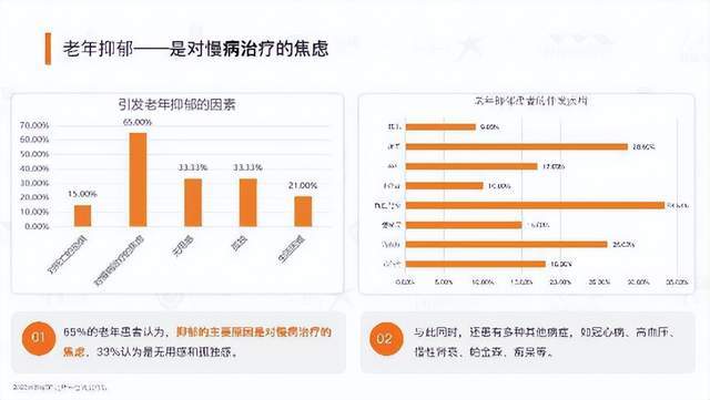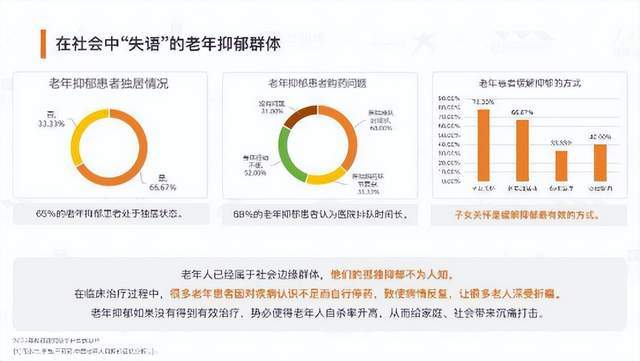 步入老年阶段的抑郁症患者主要焦虑来自于慢性疾病的治疗。老年患者在罹患抑郁症的同时,还伴有其他躯体疾病,如高血压、糖尿病等。老年人多处于独居状态,他们的孤独和抑郁不为人知,如果没有得到有效治疗,将会使得老年人自杀率升高,从而给家庭、社会带来沉重打击。而在抑郁症治疗的过程中,医院排队时间长、身体行动不便、购药环节负责、对疾病认知不充分成为困扰他们的主要问题。