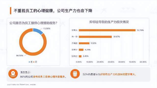 职场抑郁关乎甚大,如果不重视员工的心理健康,公司生产力会下降。调查显示,86%的公司没有给员工提供心理关爱服务,52%的患者认为抑郁后生产力的损失程度非常大。