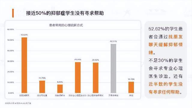 然而,虽然有一半的抑郁症学生患者会通过朋友倾诉、父母沟通或其他渠道进行求助,但仍有46%的学生没有寻求任何帮助,而近30%的学生从未想过寻求专业心理医生的帮助。 青少年罹患抑郁症现象不容忽视,我们应当在社会、家庭、个人之间构成良好的动态关系,相互影响、促进改变。
