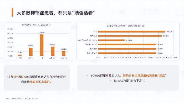抑郁症对大多数人的生活带来了严重的影响。用户调研数据显示,“疲惫”、“动力不足”、“记忆力下降”、“注意力不集中”等成为影响生活质量的重要因素,仅有18%和3%的患者认为自己当前的生活质量比较好和非常好。