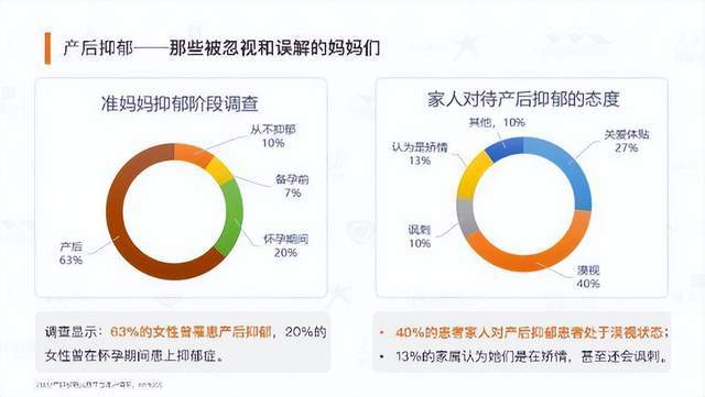 调查显示,63%的女性曾罹患产后抑郁。女性患上产后抑郁的原因有多种,社会家庭身份的变化、哺乳喂奶、家庭关系等,是诱导产后抑郁爆发的几大主要导火索。严重产后抑郁者,可出现自残或自杀的倾向,必须给予重视及警惕。然而,40%的女性在患上产后抑郁时被家人漠视,部分家属对女性产后抑郁的认知仍然停留在“矫情”层面,甚至出言讽刺。