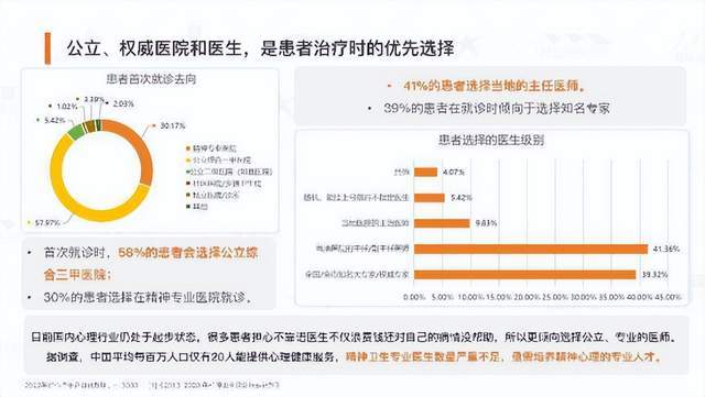 目前国内心理行业仍处于起步状态,很多患者担心不靠谱医生不仅浪费钱还对自己的病情没帮助,所以首次就诊时,58%的患者会选择公立综合三甲医院,30%的患者选择在精神专业医院就诊。由此可见,公立、权威医院和医生,仍然是目前抑郁患者治疗的优先选择。