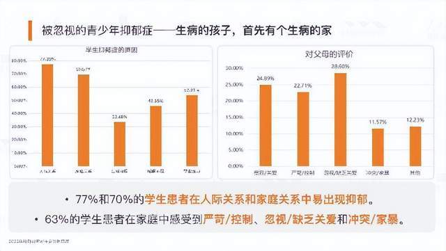 对青少年抑郁症患者来说,病态的家庭环境是使其陷入抑郁的首要因素。63%的学生患者在家庭中感受到严苛/控制、忽视/缺乏关爱和冲突/家暴。
