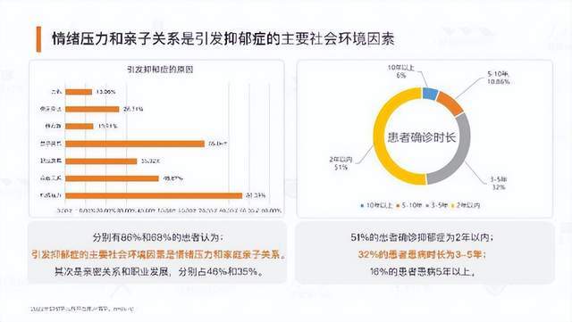 抑郁是国民的高发情绪,其背后更多的是情感的压抑。据用户调研结果显示,情绪压力和亲子关系是引发抑郁症的主要社会环境因素,其次为亲密关系和职业发展。 51%的患者在2年以内被确诊为抑郁症,32%的患者患病时长为3-5年,16%的患者患病5年以上。