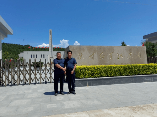 牛华朝与列宁学校校长方向阳 第二站是参观戴占魁革命事迹陈列室,听取了林镇乡副乡长剡生瑶、范台村支书谢东杰、戴占魁革命事迹陈列室负责人白善分别对陕甘老红军戴占魁英雄事迹和革命精神的讲解。