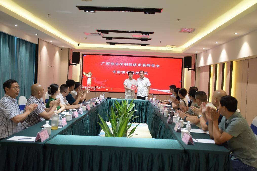广西非公有制经济发展研究会向广西红木家具协会党支部书记李春贵颁发研究会入库专家聘书。