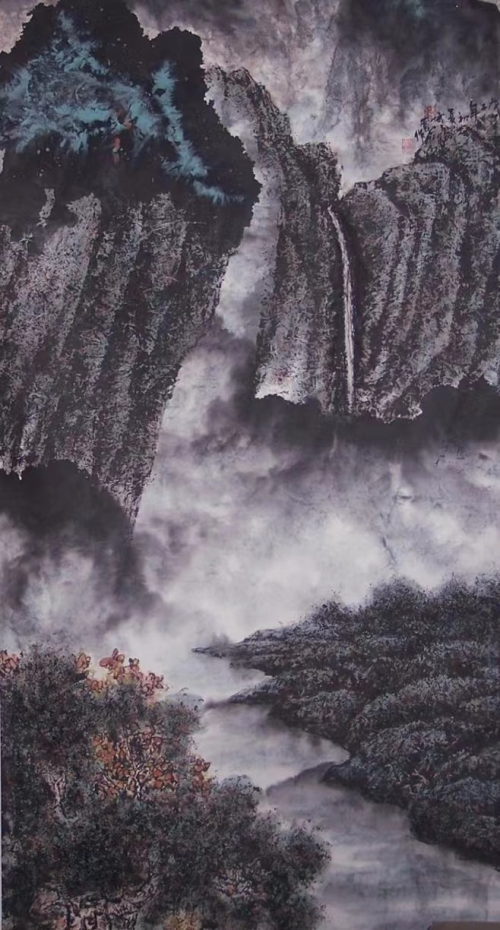 水创作独立画科,从展子虔的游春图开始,到现在经过了千年以上的传承,已经形成了一整套严谨的法度体系,今人画山水,首先要向法度致敬,从专业上提升中国山水的塑造品质。观赏陈风云先生的山水作品,都是经过专业历练的毫无瑕疵。落笔骨法用笔,起笔丰姿多神,线条的勾勒相当完美。勾时一气呵成,相当流畅,勒时顺势而为,绝不滞碍。长线短线,交织细腻,没有凌乱,不让一根线条成为散兵游勇。如此精彩的线条塑造力,必然是经久历练的成绩!果然是明公绎思挥彩笔,驱山走海置眼前。他把中国画依线条而造型的真谛表达得炉火纯青,游刃有余!这是陈风云之所作在专业层面很有影响力的重要原因。
