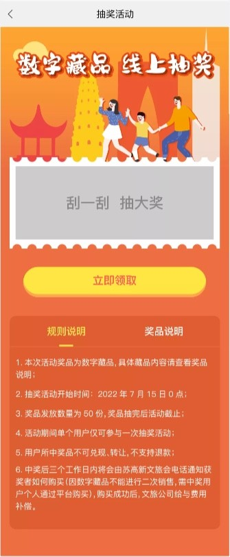 另外,因数字藏品不能进行二次销售,需中奖用户个人先通过平台锁定,苏州高新文旅集团有限公司将在中奖后3个工作日内电话通知获奖者如何获取。用户所中奖品不可兑现、转让,不支持退款。(邹玉芬) |