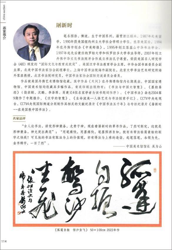 第三本是《中国拍卖》杂志2022年第4期。 《中国拍卖》杂志是2006年经国家新闻出版署批准,商务部主管、中国拍卖行业协会主办,在果外公开发行的一本国家级期刊。今年3月底,《中国拍卖》杂志的主编看到屠新时的书法作品专辑后,点名邀请屠新时作品和文字介绍以两整页篇幅,登载在下月出版的该杂志“画家推介”专栏中。