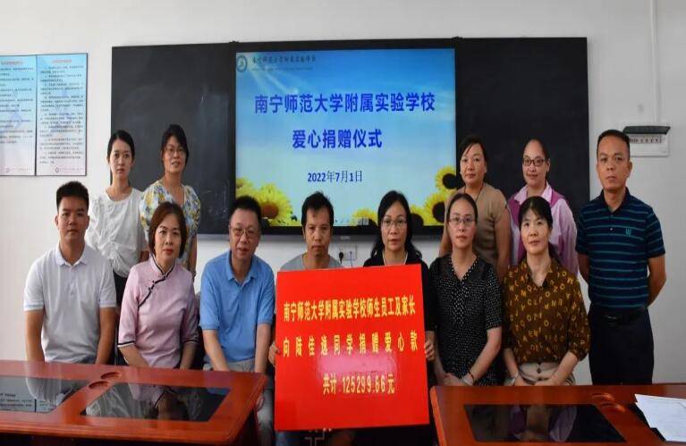 病魔无情,人间有爱。短短的三天时间,孩子们掏出了自己的零用钱,家长们慷慨解囊,教师们倾情相助:10元、50元、100元、200元……涓滴之水成海洋,爱心播撒种希望,全校师生员工及家长共募捐筹得善款125299.66元。闻知此讯的南宁师大机关党委康治余书记也捐了500元。善美附校人用实际行动诠释爱的真谛、传递爱的温暖。