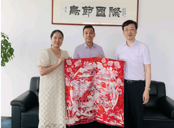 乌节国际品牌高级顾问邓涛先生特地为中新友谊设计一款重庆与新加坡元素融合为一体的新款文创丝巾。 参与会见人员还有乌节国际中国区助理总裁章婧景、投资顾问盛国镇等。 作者:OIH 编辑:毛凤君 摄影:金旗明 |