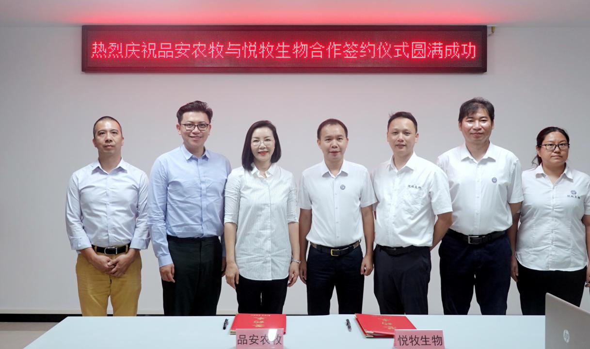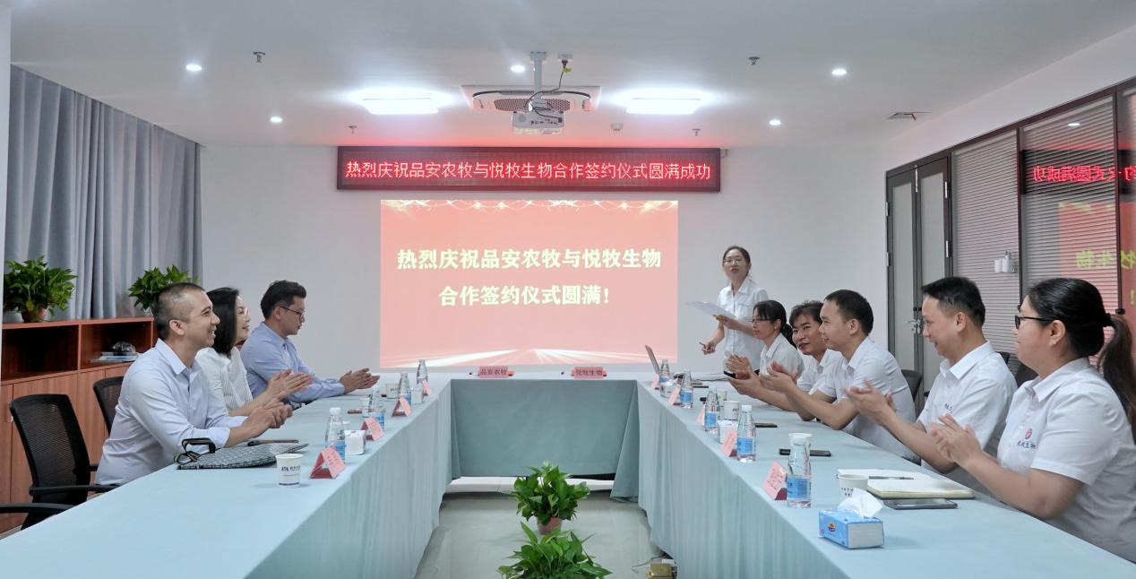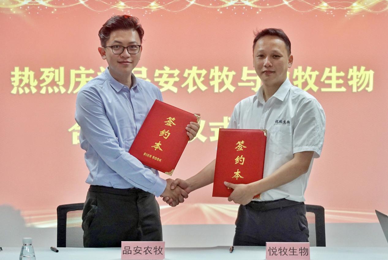 2022年7月15日,广西品安农牧投资集团有限公司(以下简称“品安农牧”)与广西悦牧生物科技有限公司(以下简称“悦牧生物”)正式签订协议,计划共同成立合资公司(以下简称“公司”),以生猪病源抗体检测为基础,全面开展生猪全产业链高层次发展业务。品安农牧董事长何苑、首席运营官李丞壕,悦牧生物董事长张远波、总经理潘杰等出席本次签约仪式。