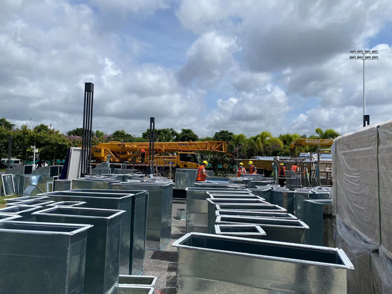 施工现场。 了解到现场因时间紧急、交通管控等问题,急需3000平方米的风管材料。方胜红立即组织60多名工人就近将在建项目北海中医医院新院区项目符合图纸要求且已完成安装的风管约800㎡、电缆800多米拆除,转运至现场投入使用。剩余材料同步下单,由南宁加工车间紧急通宵制作,次日上午11点运至北海。涉及困难的异型构件由北海中医院工地加工车间24小时不间断制作,分批次转运至现场。