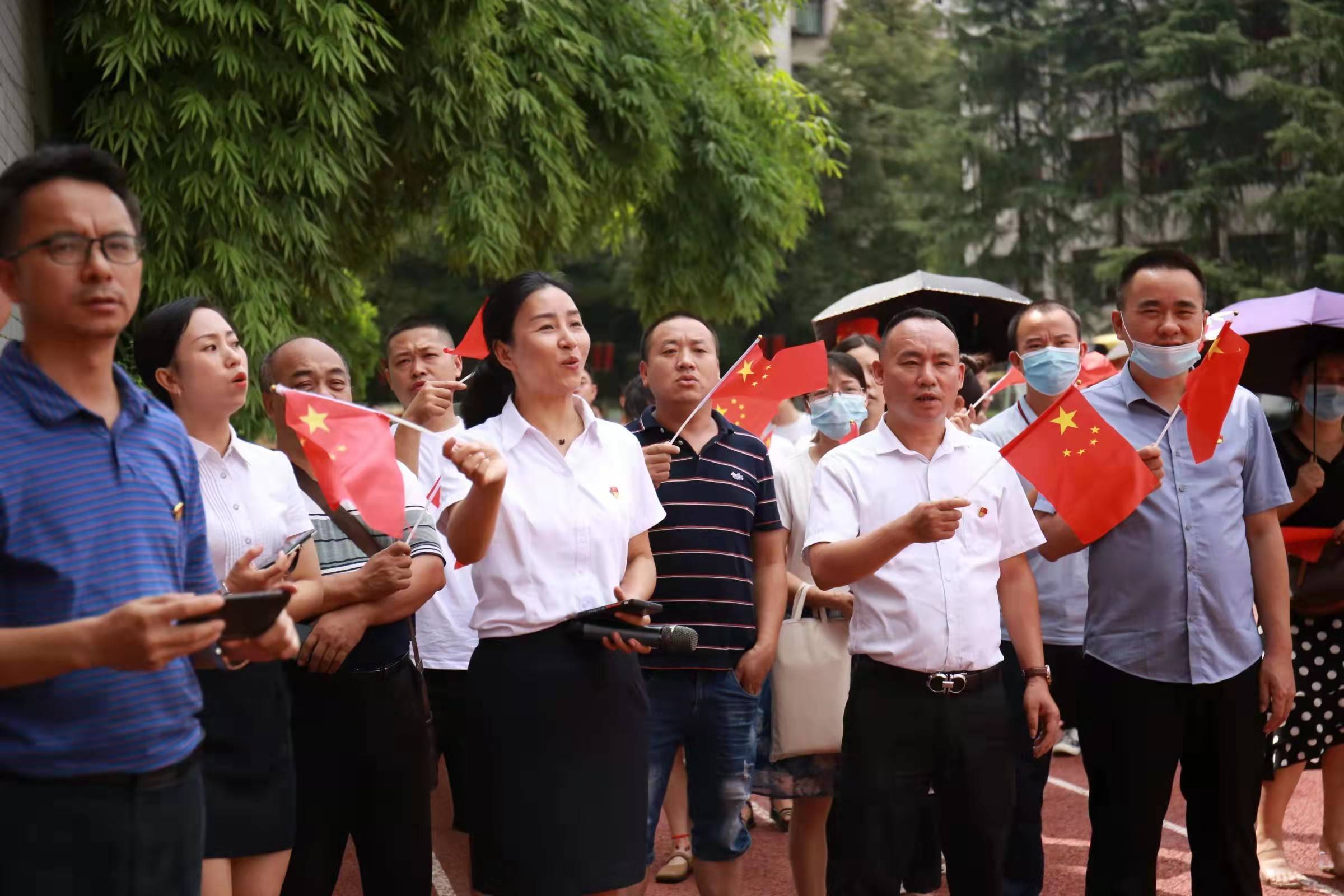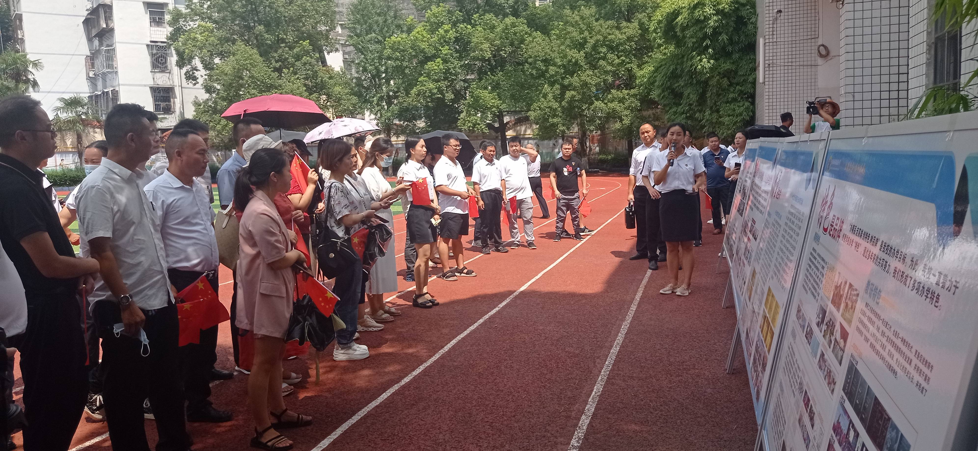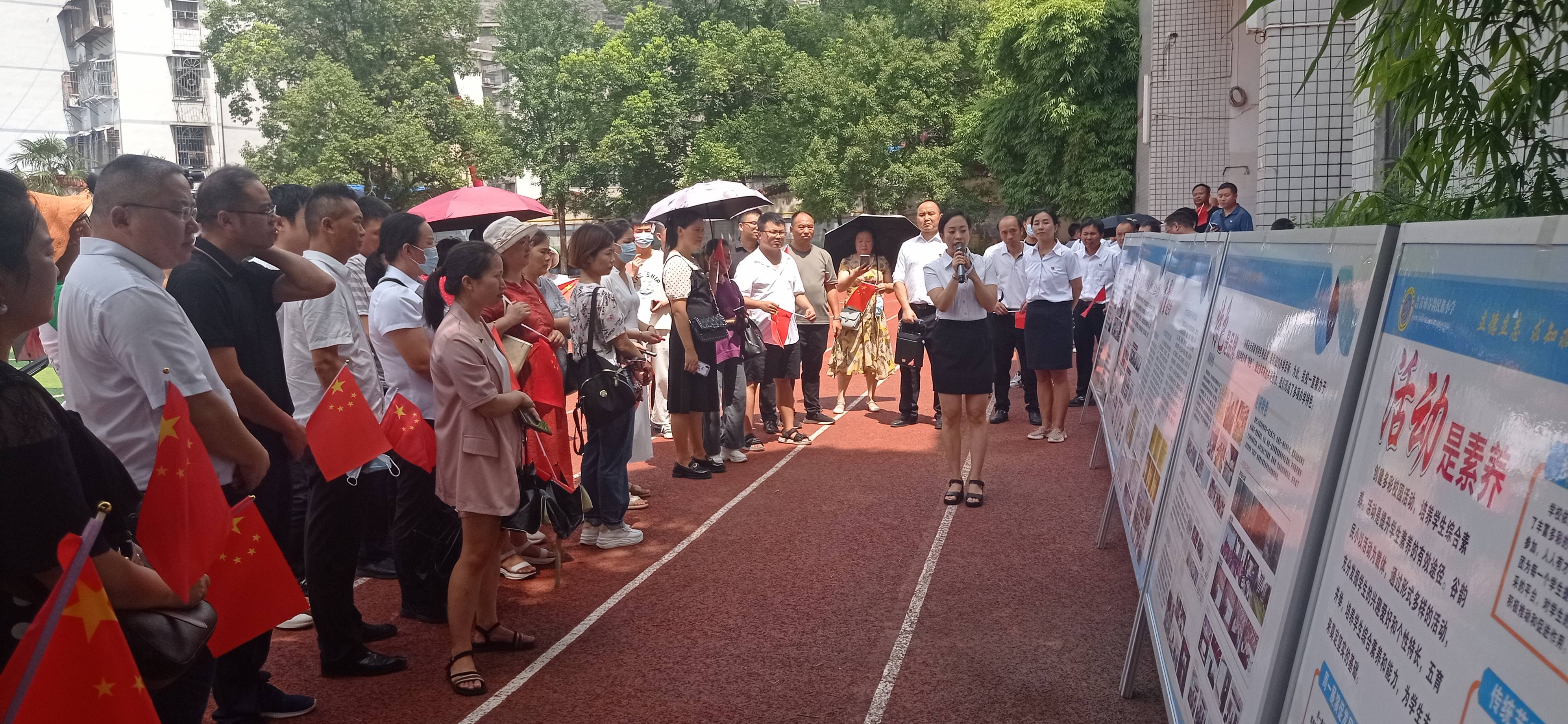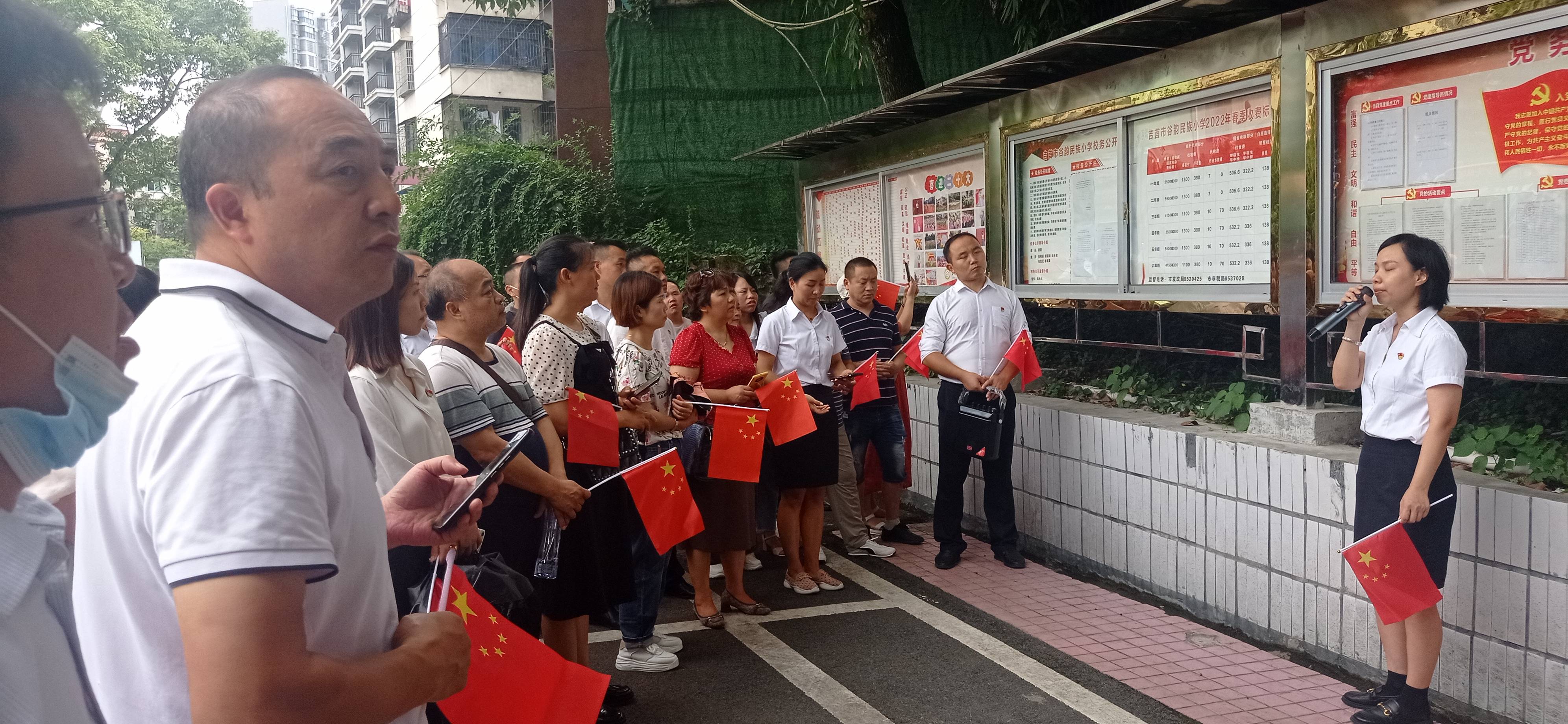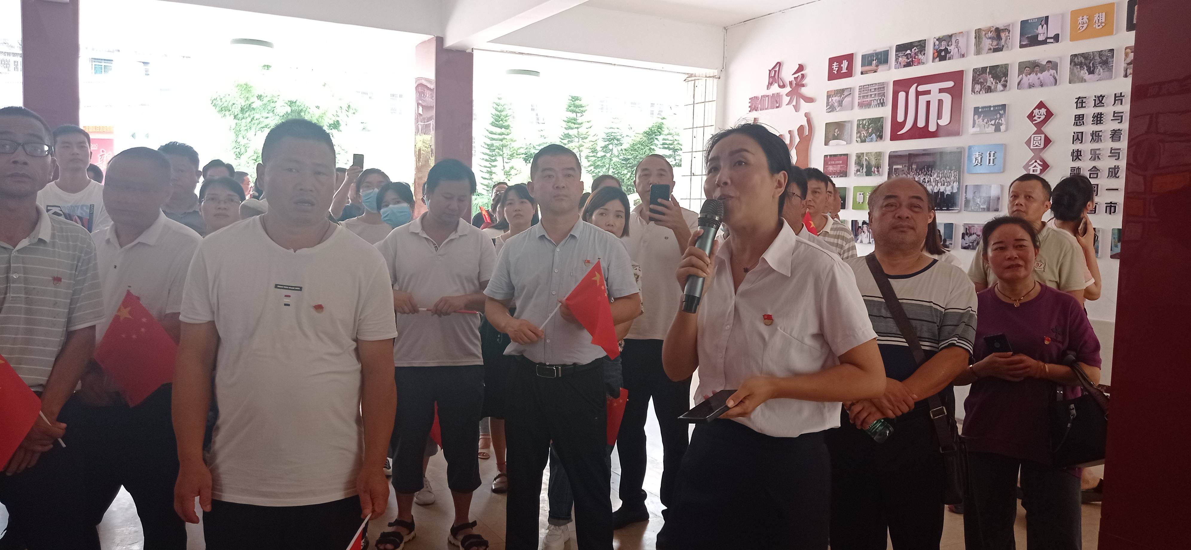 在主席台前,学校党员教师谭捷、杨建为全体学员深情地朗诵了现代诗歌《厉害了,我的国》,并与全体学员互动合唱歌曲《没有共产党,就没有新中国》。戚丹老师向学员们介绍学校特色建设情况。学员们还参观了学校文化大厅、“三制一卡”墙以及党员活动室。