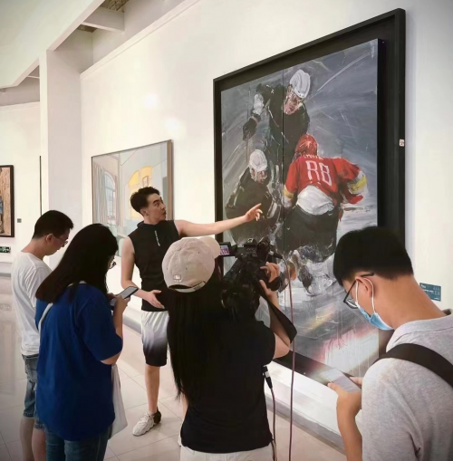 ▲《北京冬奥冰之舞》创作者零零后画家王东民在入展作品前接受采访