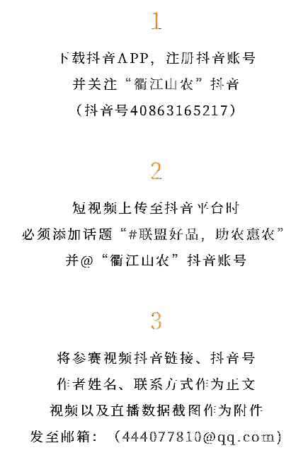 十、其他事项 1、参赛作品保证画面清晰,发送邮箱文件格式统一为MP4文件(文件命名:姓名+抖音账号名+联系方式); 2、参赛者必须添加关注“衢江山农”官方抖音账号; 3、比赛期间不得通过违规手段购买视频点赞量、转发量、直播最多观看人次数等数据,一经发现取消比赛资格; 4、主办方可以重复使用获奖作品进行宣传、展览,主办方尊重和保留作者的署名权,不另付酬劳; 5、主办方对本次大赛拥有最终解释权。 |