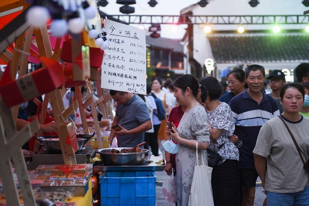 点亮嘉兴夜经济 绽放城市烟火气 赏古街美景、尝特色美食、观文娱表演……今晚7点不到,月河历史街区的文旅夜市上早已摊位林立、人声鼎沸,五彩缤纷的彩虹展位让人眼前一亮,美食的香气吸引着食客,三五亲朋好友相约在此,逛吃、聊天、拍照,热闹非凡。