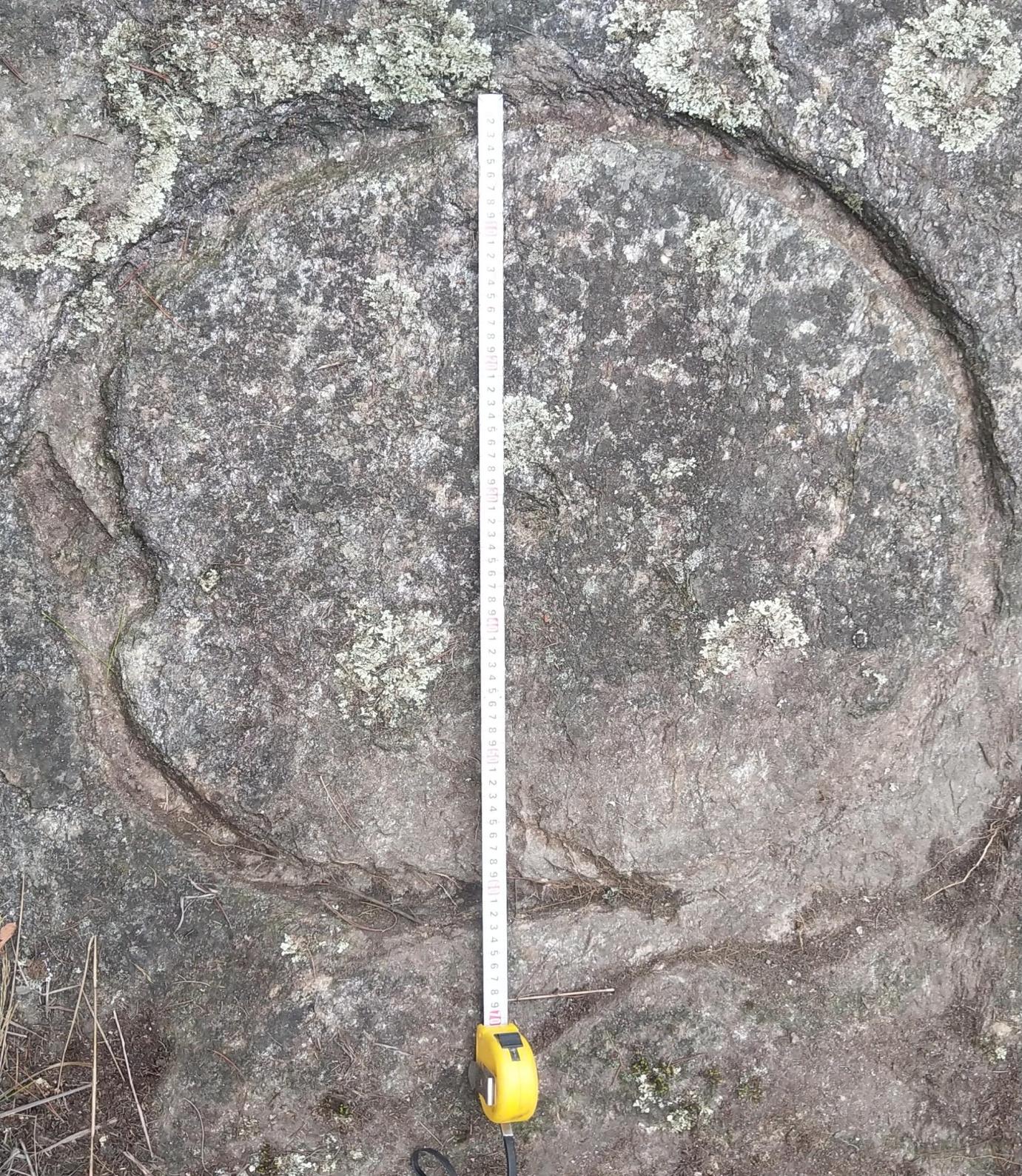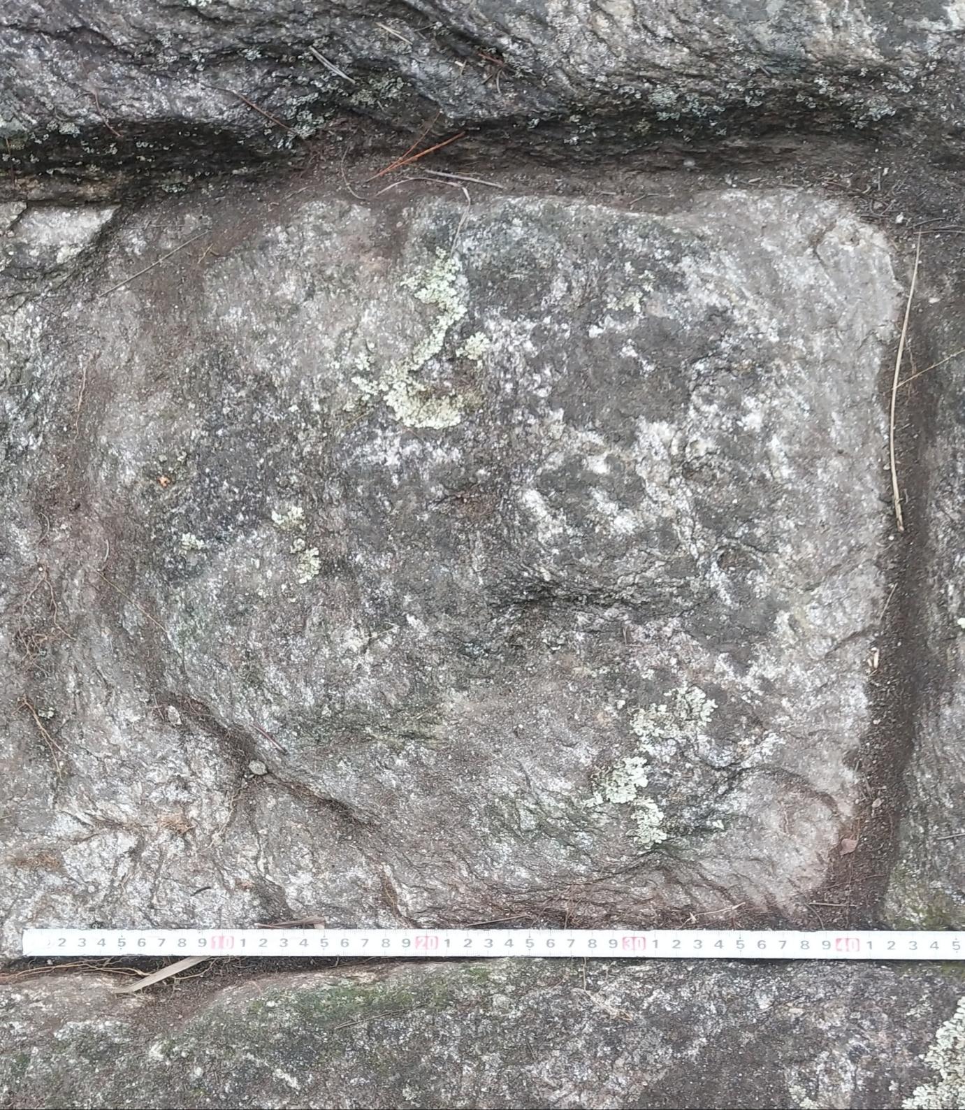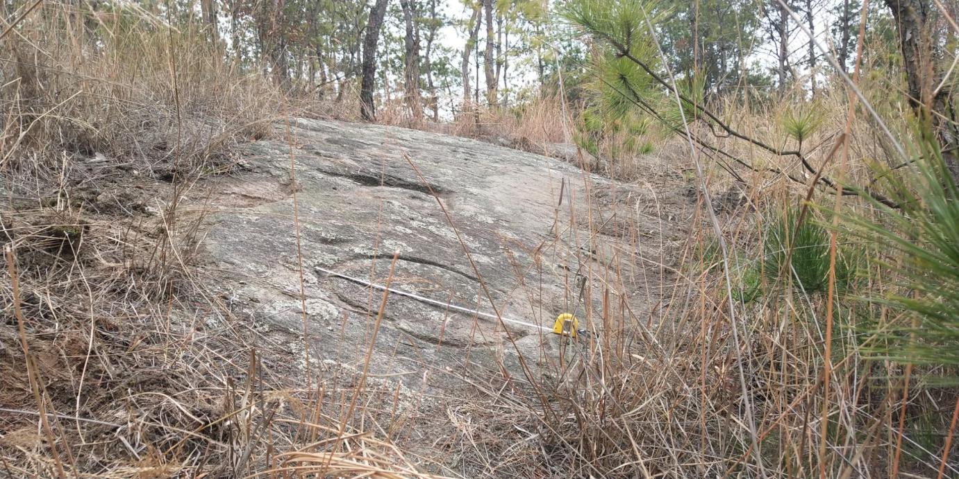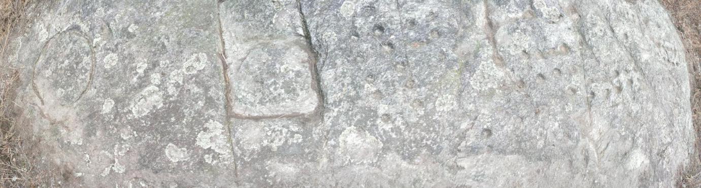 摩崖石壁“扇”形图案 此图案居于全崖壁中部,排在“⊙”形东侧,一边为弧形两边为直角,呈半月倒扣“扇”斗形,形高41CM。“扇”形内隐约可见数个人工浅圆坑点(尺寸类上),外形呈“倒扣半月”(月心朝下)的造型。根据紧邻“⊙”后的排序,按表意习惯,可断为日月的“月”。在“Chinese Etymology”(汉字源)的描述中,商周时期的甲骨文也有将“月”字描摹写成半月形。