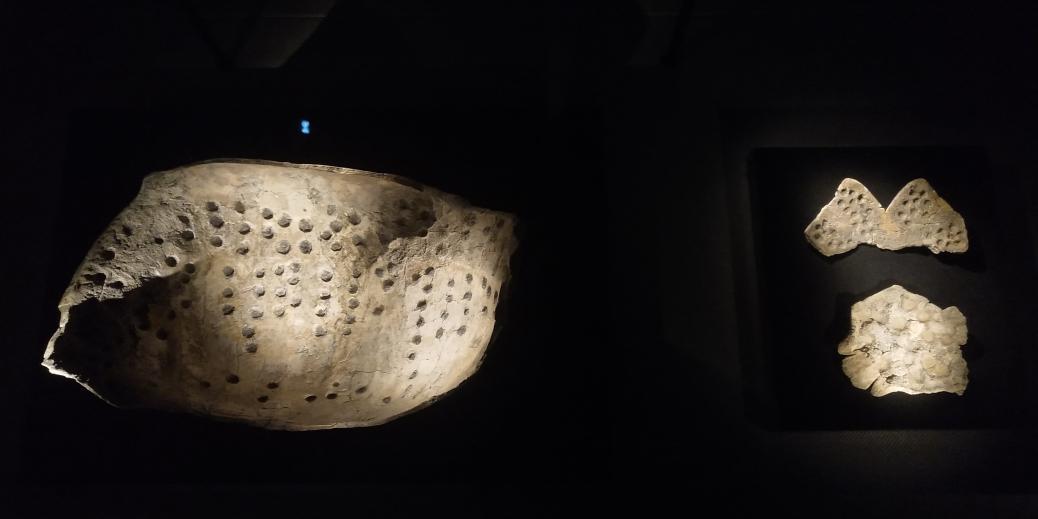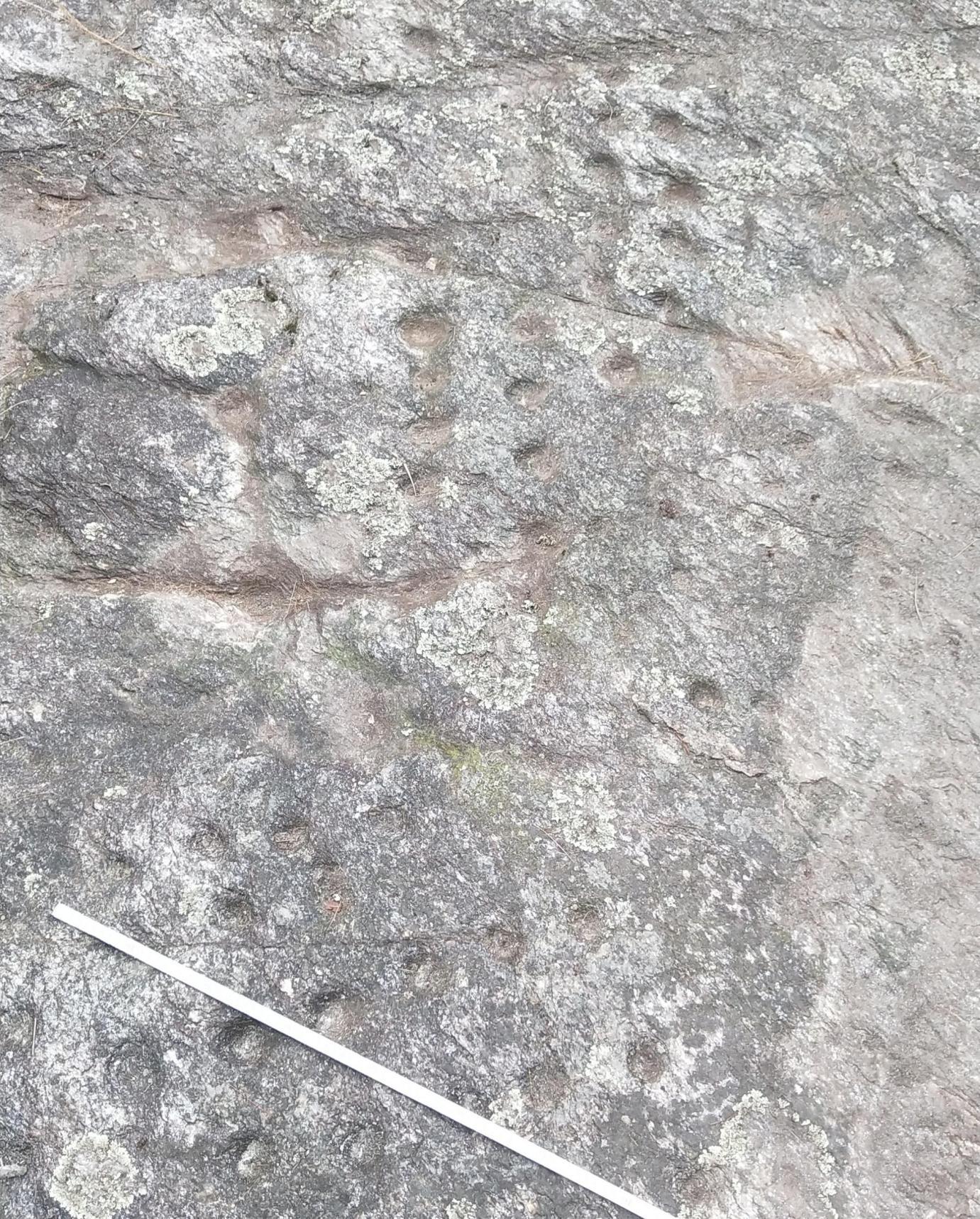 摩崖石壁矩阵状点坑集图案 图案中这些一个个排列得星罗棋布的圆点状石坑,间距均等有序,呈规则状分布,随崖面形状的变化有些又显得随意率性。但是基本风格一致,大小都在8CM至4CM之间,似出自一人或者遵从了某种刻镂规则的同一类人之手。目前肉眼所能够辩识的约有80余枚。从这些图案的造型上看,酷似盲文样式,与四川成都金沙遗址中龟板打孔件非常相似。
