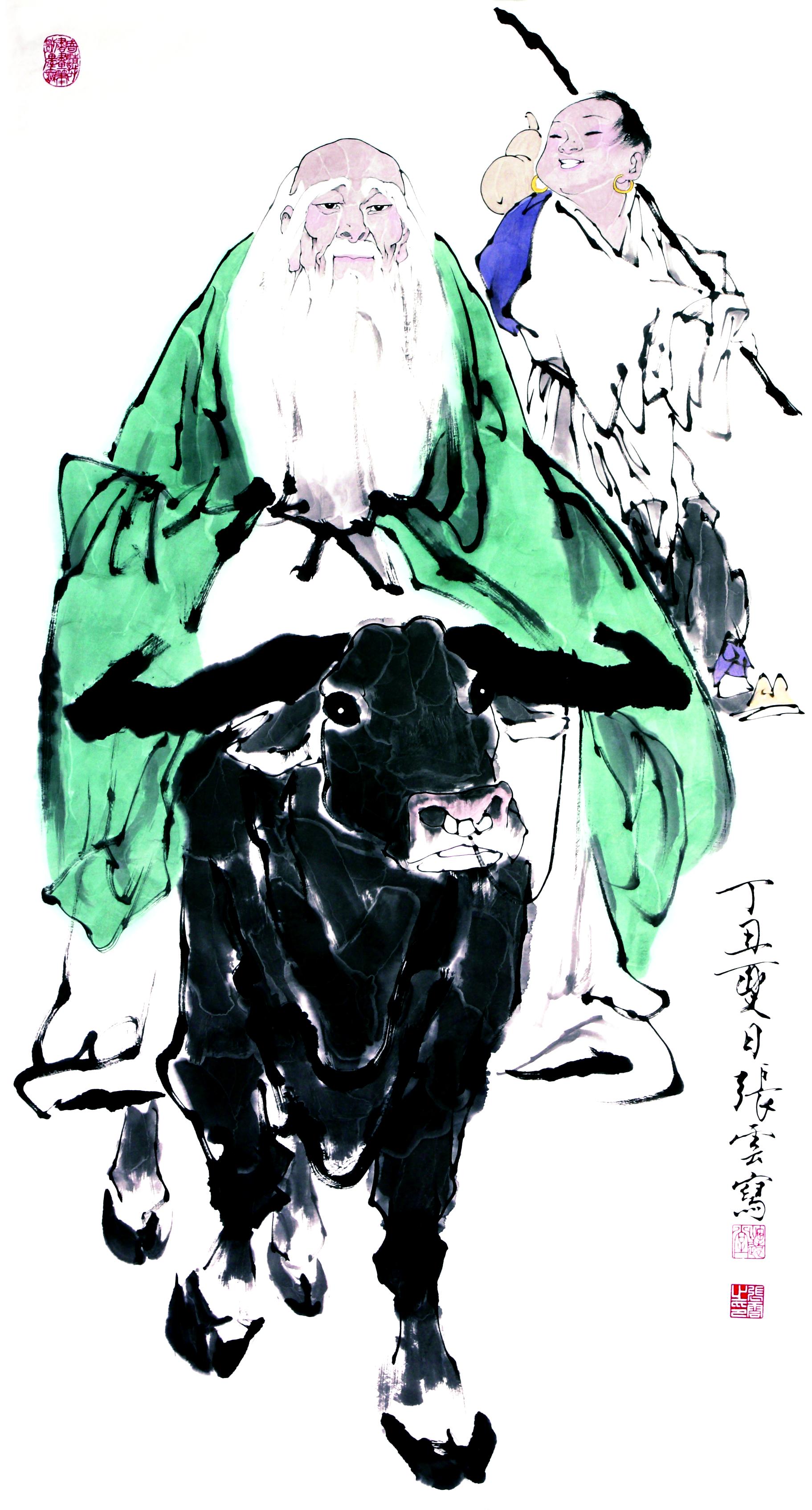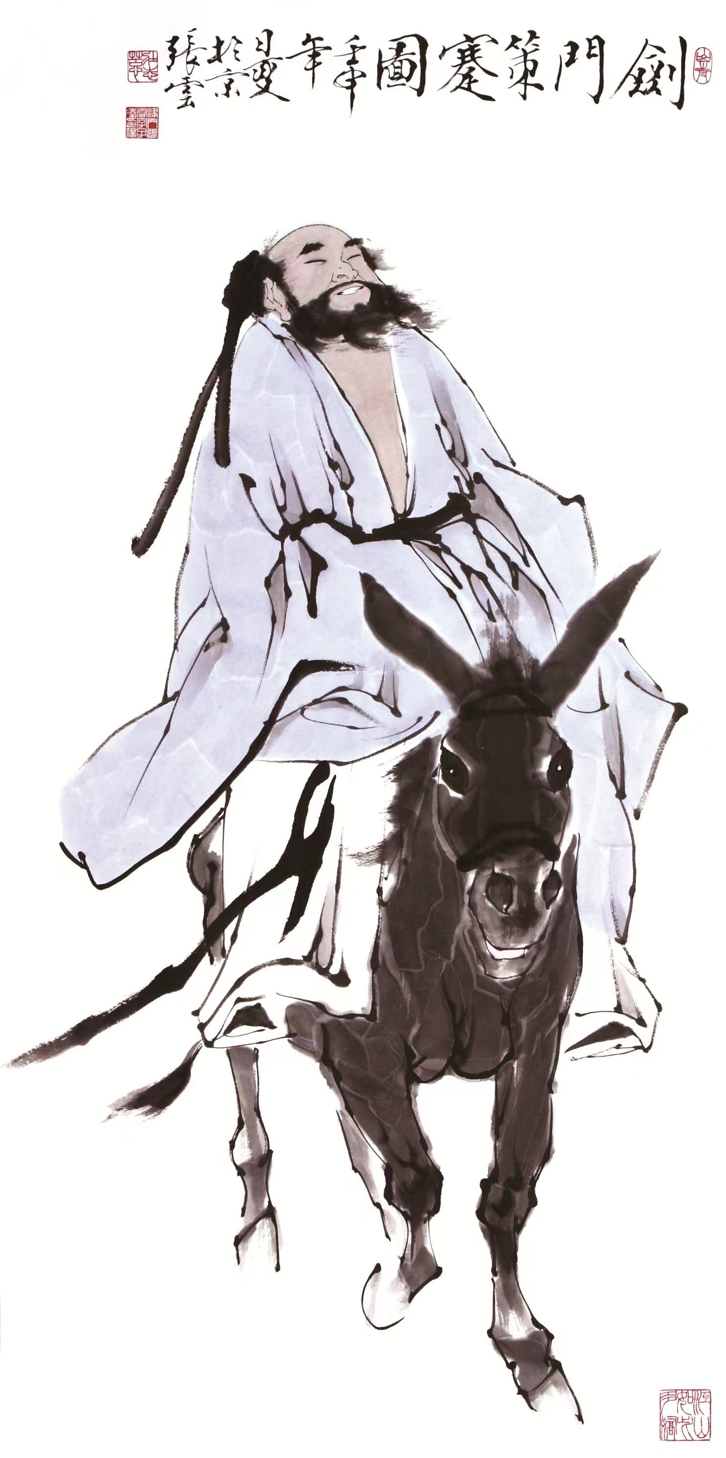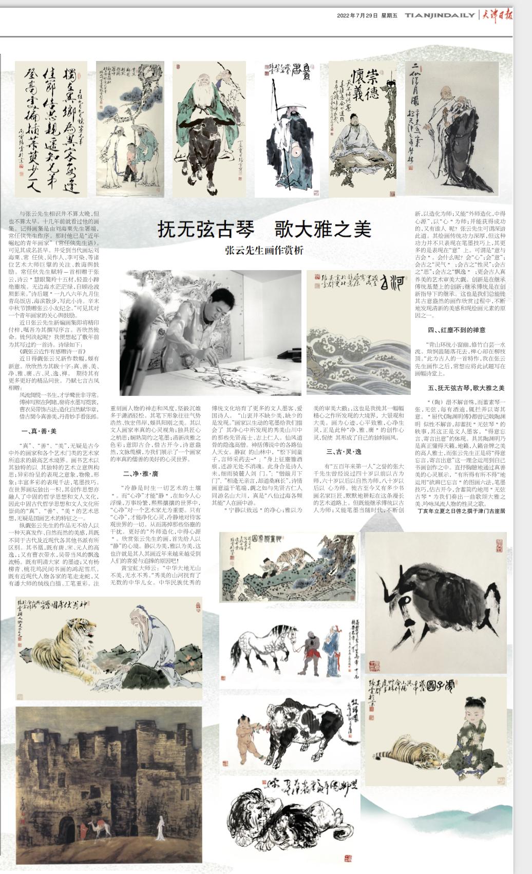 纵观张云先生的绘画作品无不给人以一种天真发作、自然而然的美感,其既不同于古代及近现代各家,又与当代的各个画派有所区别。其画风,既有唐、宋、元人的高逸,潇洒;又有曹衣出水、吴带当风的飘逸流畅。既有明清大家的墨迹笔痕;又有杨柳青、桃花坞民间年画的鸿泥雪爪。既有石涛八大画作中隐逸古僧的孤寂;又有任伯年笔下才子佳人、文人高士的风流。既有近现代人物各家的笔走龙蛇、写意笔墨;又有潘絜兹大师的铁线白描、工笔重彩。其笔下的人物“多表现情怀激烈的英雄豪杰、正道直行的文人寒士或修持得道的仙人佛子。注重刻画人物的神态和风度,坚毅沉雄多于潇洒轻松。其笔下形象往往气势浩然、恢宏伟岸,绝无纤弱俗媚之态,颇具阳遒劲之美”。其以一个文人画家率真的心灵视角、独具匠心之构思、娴熟简约之笔墨、清新淡雅之色彩,意与古会,借古开今,诗意盎然,文脉纵横,为我们展示了一个画家的率真的儒善的美好的心灵世界。