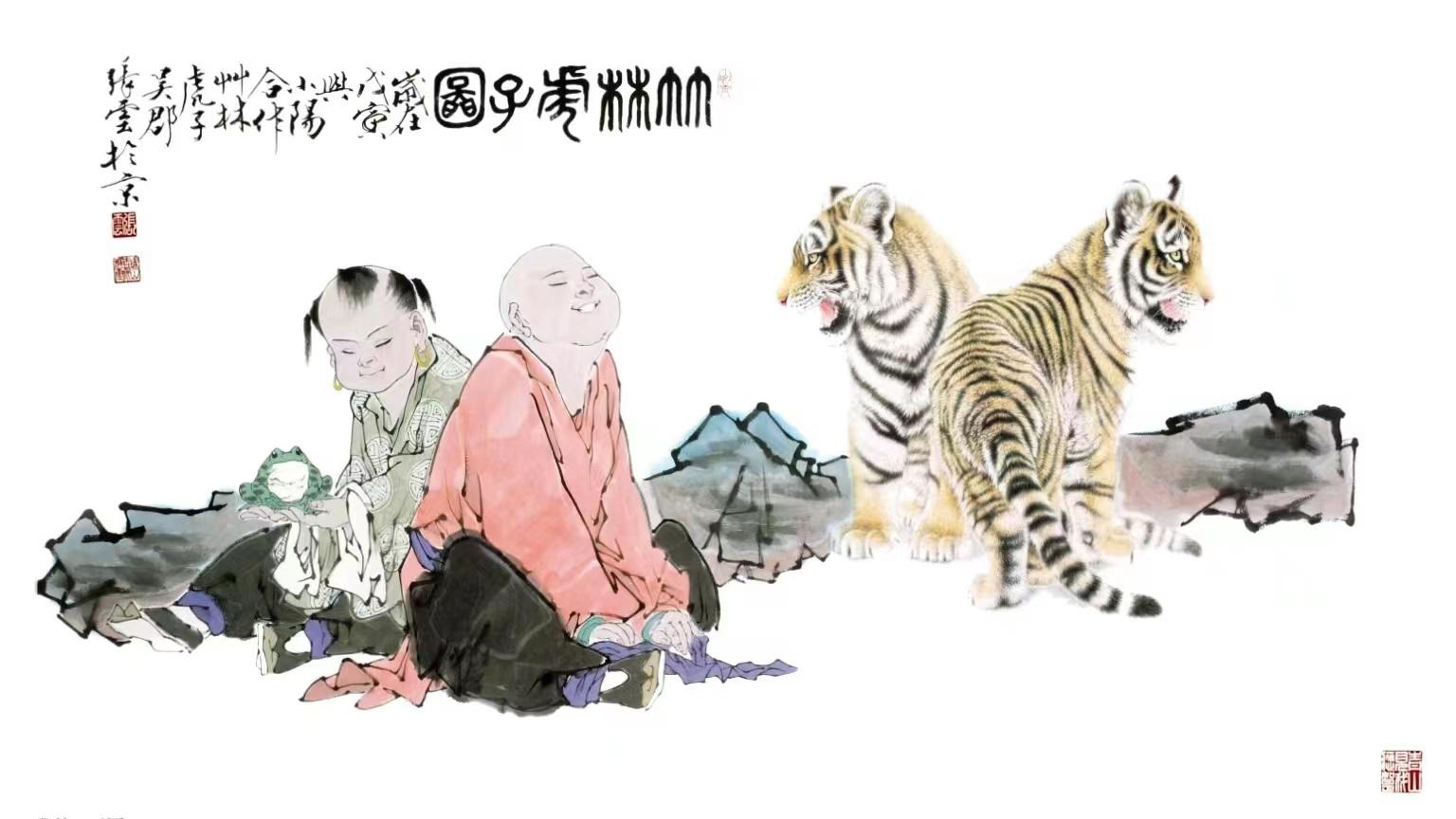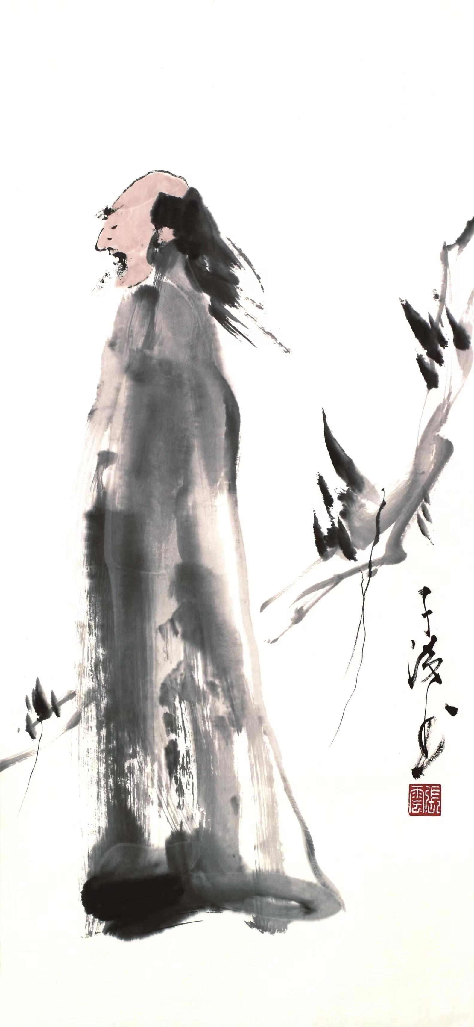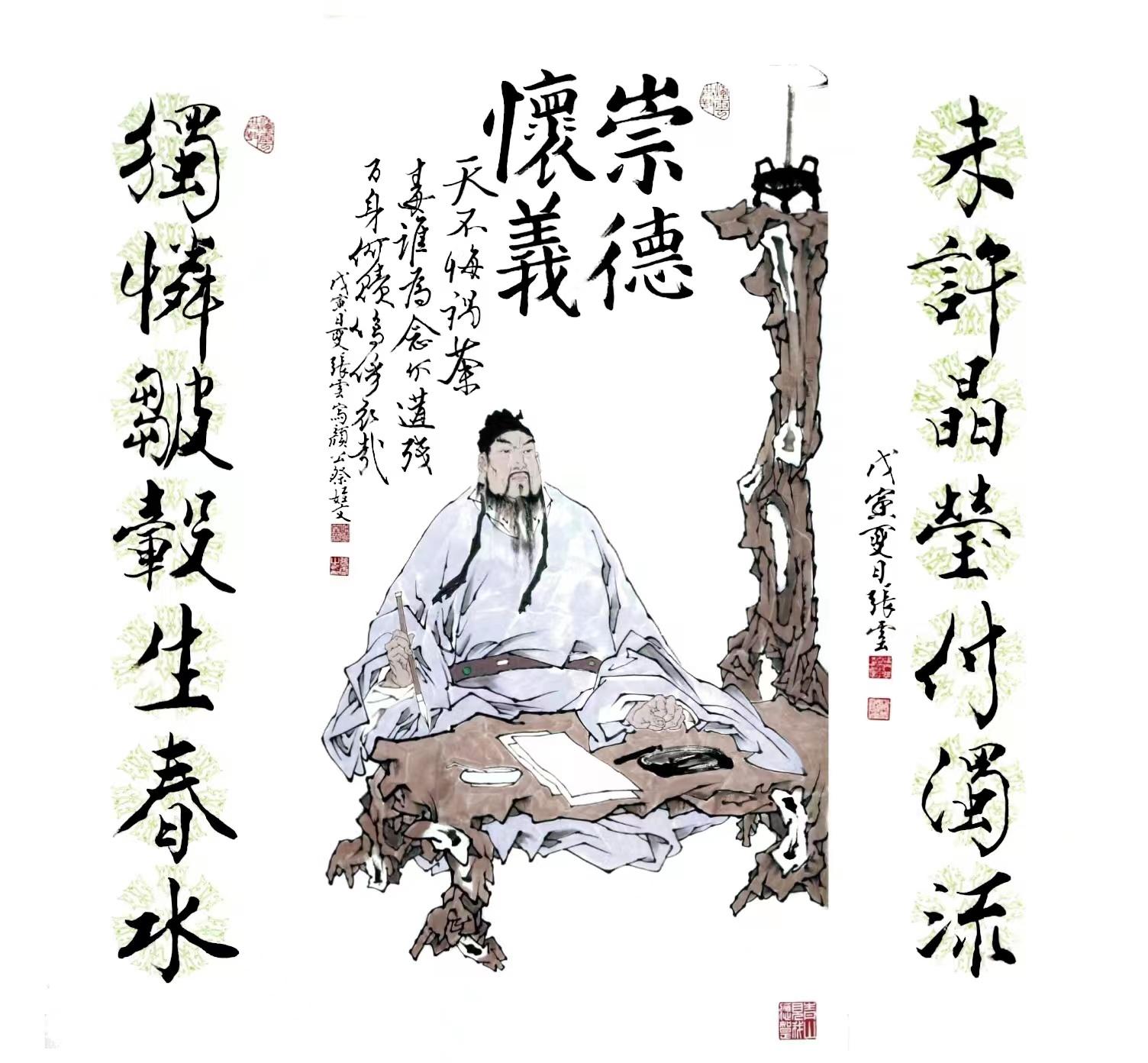 纵观张云先生的绘画作品无不给人以一种天真发作、自然而然的美感,其既不同于古代及近现代各家,又与当代的各个画派有所区别。其画风,既有唐、宋、元人的高逸,潇洒;又有曹衣出水、吴带当风的飘逸流畅。既有明清大家的墨迹笔痕;又有杨柳青、桃花坞民间年画的鸿泥雪爪。既有石涛八大画作中隐逸古僧的孤寂;又有任伯年笔下才子佳人、文人高士的风流。既有近现代人物各家的笔走龙蛇、写意笔墨;又有潘絜兹大师的铁线白描、工笔重彩。其笔下的人物“多表现情怀激烈的英雄豪杰、正道直行的文人寒士或修持得道的仙人佛子。注重刻画人物的神态和风度,坚毅沉雄多于潇洒轻松。其笔下形象往往气势浩然、恢宏伟岸,绝无纤弱俗媚之态,颇具阳遒劲之美”。其以一个文人画家率真的心灵视角、独具匠心之构思、娴熟简约之笔墨、清新淡雅之色彩,意与古会,借古开今,诗意盎然,文脉纵横,为我们展示了一个画家的率真的儒善的美好的心灵世界。
