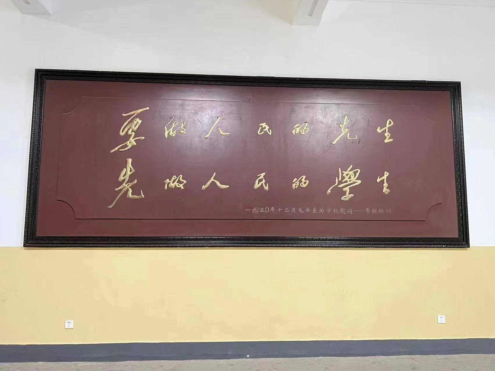 一走进第一师范学校,左右两侧的墙上悬挂着牌匾,分别上书两行醒目的字: 要做人民的先生, 先做人民的学生。 实是求是, 不要自以为是。