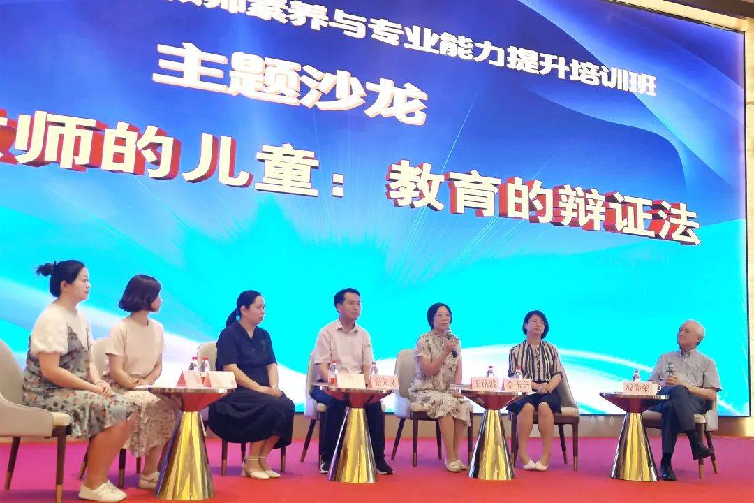 03 主题沙龙 接下来,成尚荣先生主持了主题沙龙“作为教师的儿童:教育的辩证法”。无锡市教师发展学院张先义副院长作为特邀嘉宾,和集团校长代表、骨干教师代表一起参与研讨。围绕着“儿童研究”“作为教师的儿童”“辩证法”等关键词,每个人侃侃而谈,谈自己的思考和观点。张院长讲述了几个寓义深远的教育故事,他认为教师要“眼里看见儿童,心里装着儿童”,和儿童一起走向教育的未来。