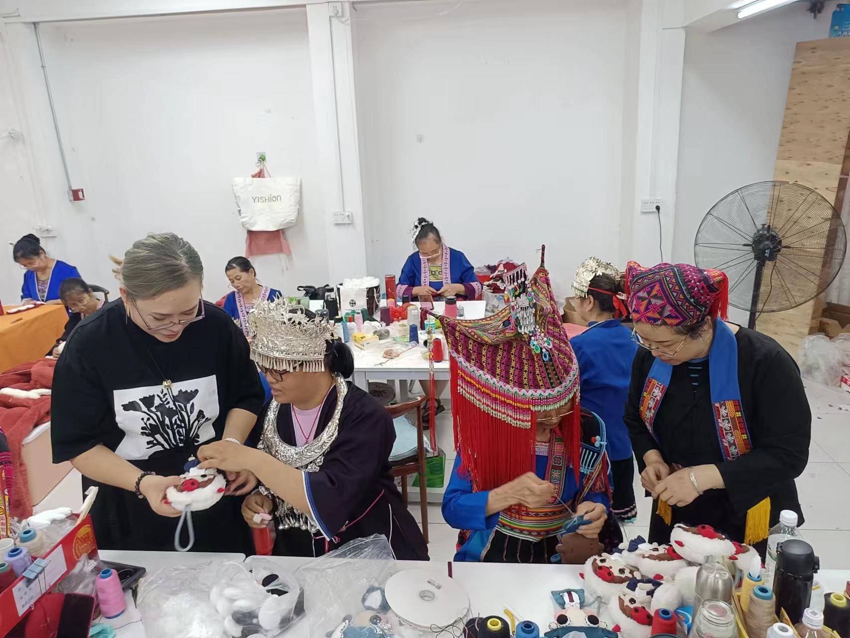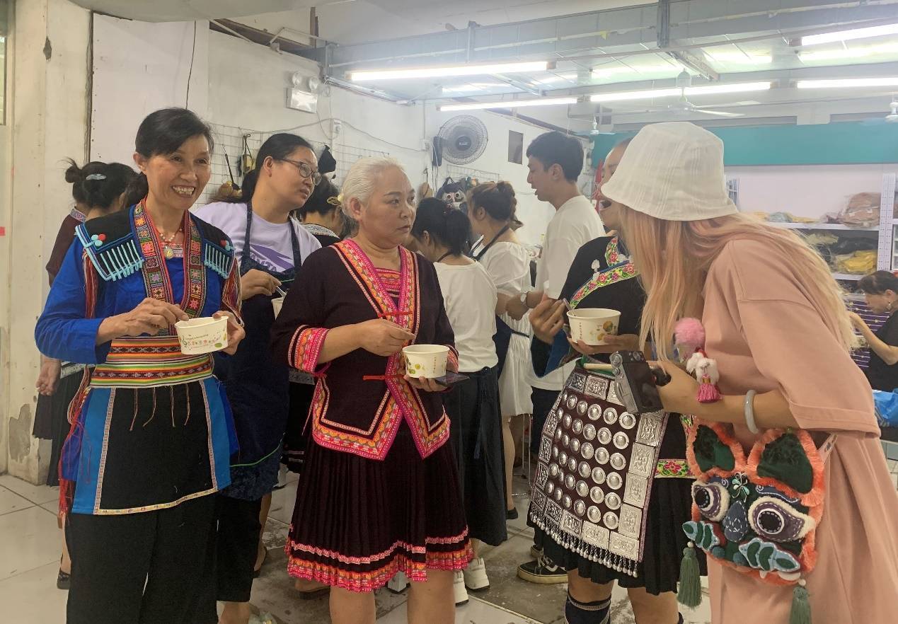 从灵川那个狭小的门面走进去,别有洞天,刘思蔚的设计工作室藏在最里面,工作室一半是鲜花绿植,一半陈列着她的数百件作品。何继良说,刘思蔚的社交很简单,社交软件很少用,平时几乎不出工作室,全部的工作都在设计上,她的想法就像桂林山里的泉水,不断涌出来。在何继良眼中,刘思蔚就像一个宝藏女孩,脑子里有源源不断的创意,“但她需要被保护,不善言辞,不喜欢社交,不太喜欢商业的东西和琐碎的事情,她坚持自己的理念,只希望用自己作品来和别人对话。按照传统的逻辑,在一个商业世界,她很难成功,但她成功了”。 充满欢声笑语的绣房 刘思蔚不爱说话,可她的“芽小七手创”绣房里却一天到头飘扬着绣娘们的欢声笑语。 龙胜县县城绣房是“芽小七手创”目前规模最大的绣房,最多时有上百位绣娘在这里工作,绣房内备有油茶、解暑茶,还有微波炉等厨具,中午吃饭的时候,绣娘们将饭菜集中在一起,还会带来自己酿造的米酒一起引用,兴致高的时候一起唱民歌。 黄双易是最早加入“芽小七手创”的绣娘之一。她以前是桂林市一名退休老师,年轻的时候走过长三角很多城市,见多识广,虽然五十多岁了,但很了解年轻人用的最时髦的词汇,而且会唱瑶族、侗族民歌。