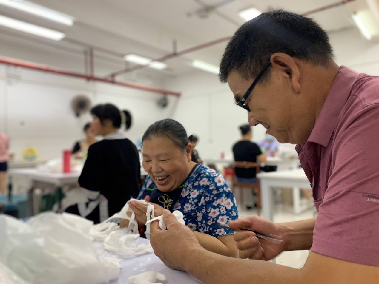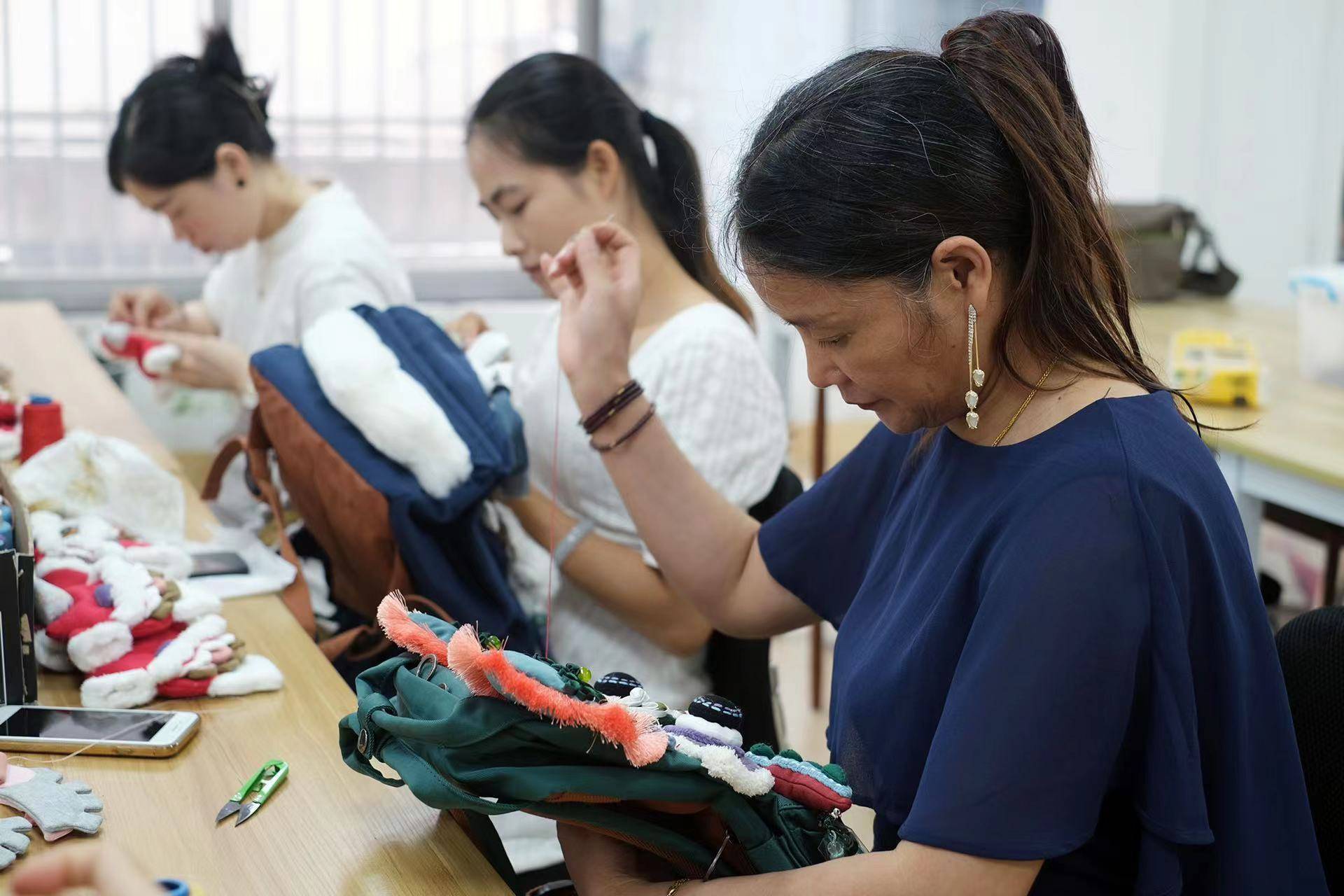 有了稳定的住所,有了稳定宽松的工作,胡凤莲慢慢开始学会安排自己的生活,一天学没上的她,学会了用淘宝购物,用微信和女儿视频,还学会了在社交平台分享自己的日常的生活。胡凤莲说,虽然腿脚不方便,但她每年都会安排两次旅游,桂林、南宁她都去过。 “我在这里是一边工作一边生活,姐妹们都很尊重我,心里畅快,做出的东西才好看,才能让大家喜欢”,听说她自己绣的手工在淘宝上很受欢迎,胡凤莲高兴得双眼弯成了一条细缝。 “芽小七手创”工作室的绣房里还有十几名宝妈,本是在县城租房陪读,正好在这里找到了一份工作。她们的月收入从两千块钱到六千块钱不等,在解决教育子女问题的同时还获得了一份不菲的收入来源。