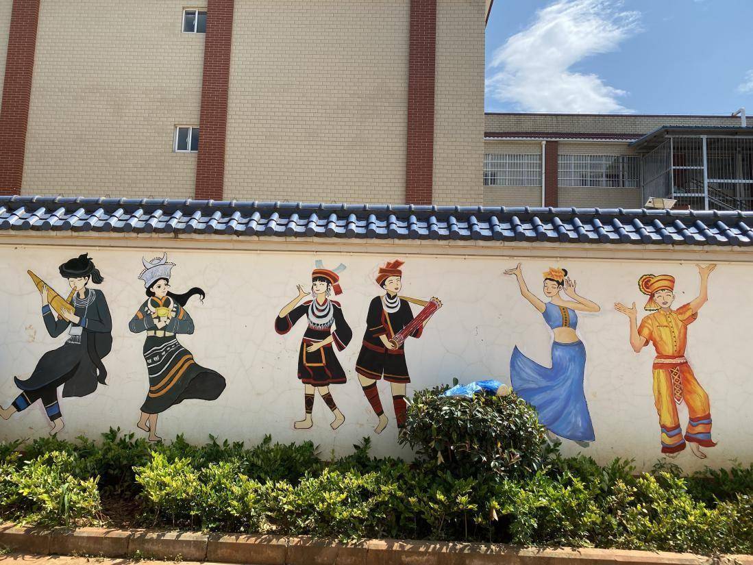 原来,西南林业大学艺术与设计学院“艺绘乡村”实践队在这里开展暑期实践活动,云南是一个多民族汇聚的省份,少数民族众多,水源保护区人民法庭位于昆明市盘龙区白邑村,这里住着苗族、彝族等少数民族。西林学子根据当地民族文化和民族团结为主题创作了一幅幅美丽的画卷,将蓝天、绿水、青山“搬”上文化墙,将院内原本光秃秃的墙体“大变身”,用特色文化墙绘扮靓美丽白邑,用大学生的专业特色助力民族团结和乡村振兴。