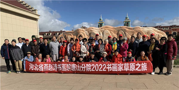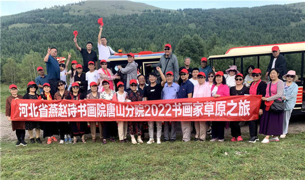 “情满秋山笑满车,川吟岭诵正行歌。云携岚气牵琼翠,载我心诗对你说”。诗人罗景萍用《七绝.快乐草原游》描绘了出游的诗书画家们的心情。“2022书画家快乐草原行”活动是由院士陈兆光发起,院长穆树利,副院长王世平、林华勇,顾问张恩栋,副秘书长那显华以及院士于立新、张立清、仇瑞莲、常凤霞、苑秀芬、王则平、王洪艳、葛丽等积极响应和支持,五十多名诗书画家参加了活动。从十八花海、千松坝原始森林、柳树沟集草原、花海、湿地、湖泊于一体的生态园地。到白桦林、狂欢谷,色彩斑斓的童话草原景区。从蓝蓝的天空,清清的湖水,皮筏漂流,到奔驰的骏马,成群的牛羊、浩瀚的草原。天下美景,万种风情。著名诗人王跃东一首七律•:《坝上草原行寄情》;“云路同行叹有缘,草原应嵌在琼田。惊随河上漂流客,乐属花中奔走仙。雨水浇林风写意,山光佐酒影陪筵。那些歌咏那些画,逢夜常回梦里边”。抒发了澎湃的激情。罗景萍的《七绝•快乐草原游》:“情满秋山笑满车,川吟岭诵正行歌。云携岚气牵琼翠,载我心诗对你说”。郭广玲的《卜算子•草原行》;“坝上草原行,云朵身边绕。叠翠山峦舞香纱,溪水潺潺跳。仙草牧牛羊,碧野红衣悄,一望无垠绿与黄,抛却心中傲”。王粹利的《畅游草原》:“白云约我到丰宁,溪水潺潺流入情。桦树林中芳草碧,不时闻得乳牛声”。描绘了大草原的美丽风光。