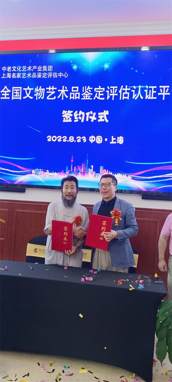 2022年8月23日,由中老文化艺术产业集团文拍通连锁拍卖平台联袂上海名家艺术品鉴定评估中心,共同打造“全国文物艺术品鉴定评估认证平台”合作签字仪式在沪举行,这标志着双方对艺术品市场深耕的合作全面开展。