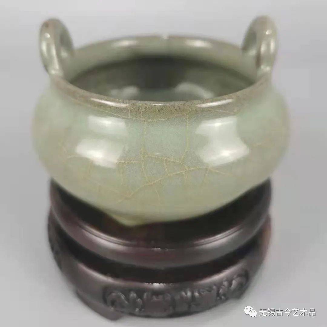 该瓶口呈长方形,颈部有三道弦纹,左右设管状耳,垂腹,下腹有一道凸出的弦纹,长方形底足,器内外施釉,满釉垫烧,釉面润泽,满布细小开片,足端见黄色澄泥胎,足底见土沁。 南宋官窑 1. 青釉琴炉 尺寸:高 5.8厘米