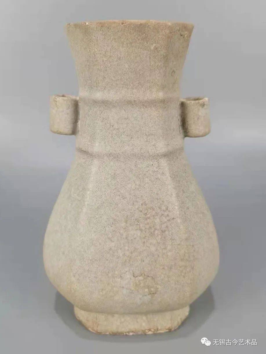 该瓶口呈椭圆形微外撇,颈部和上腹部各有一道凸出的弦纹,依颈部弦纹左右两侧各设一管状耳。椭圆形底足微外撇,器内外施月白釉,满釉垫烧,釉面满布细开片。一侧底足端剥釉,可见细腻的黄色澄泥胎。由于保存条件关系,口沿有剥釉,瓶体有裂痕,土沁较重。 2. 月白釉六棱贯耳瓶 尺寸:高18.7厘米