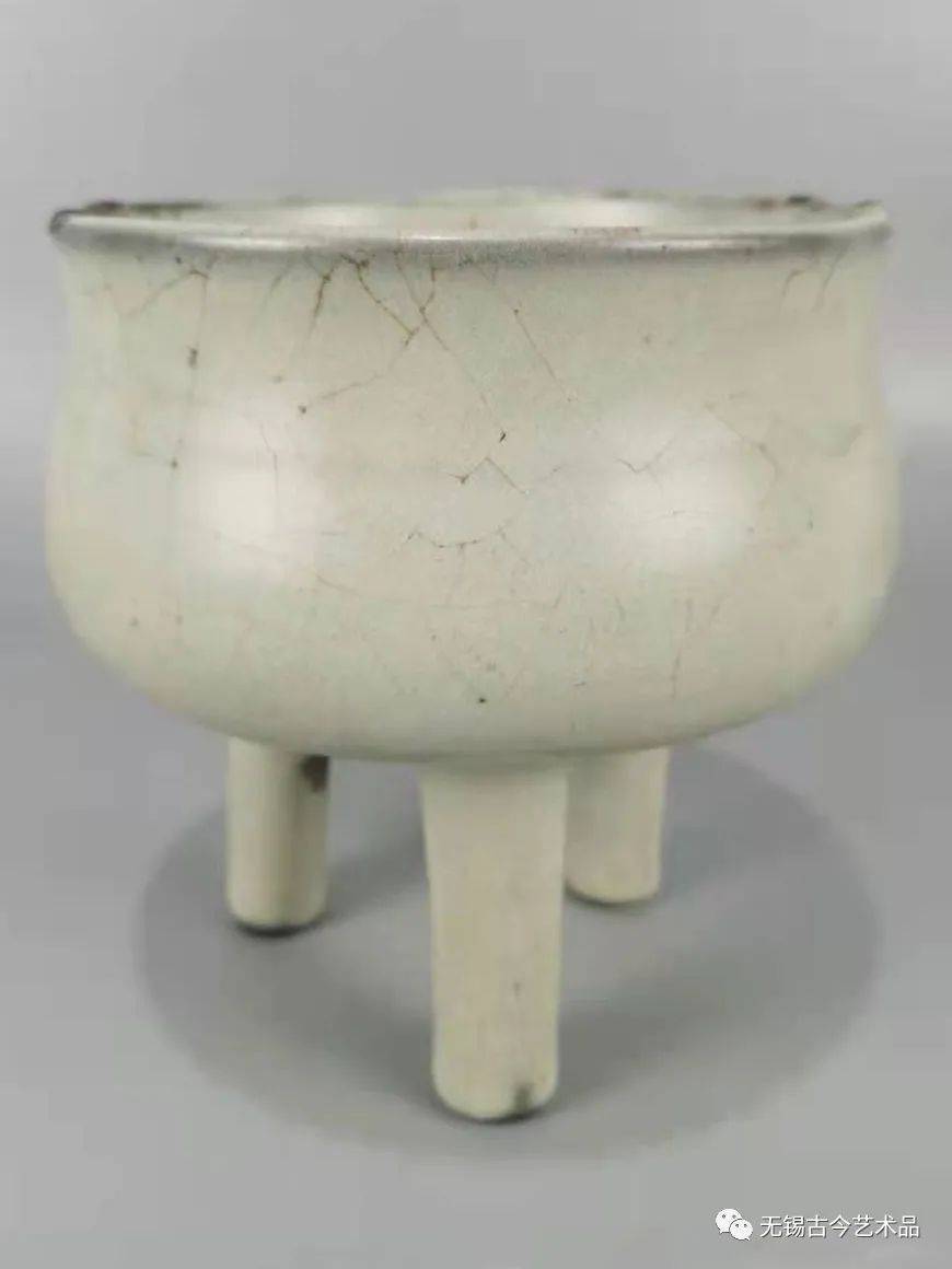 该琴炉三足双耳,弧腹,腹压三棱,下承小三足露胎呈黑色,器内外施青釉,紫口铁足,釉面肥润有不规则开片。该炉原是船木泽二公司的藏品。 2. 月白釉葱管三足炉 尺寸:高 17.6厘米,口径16.1厘米