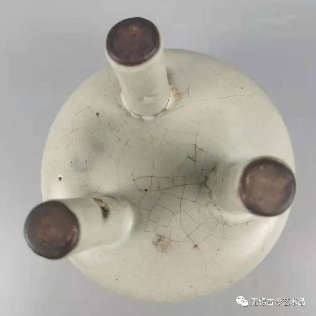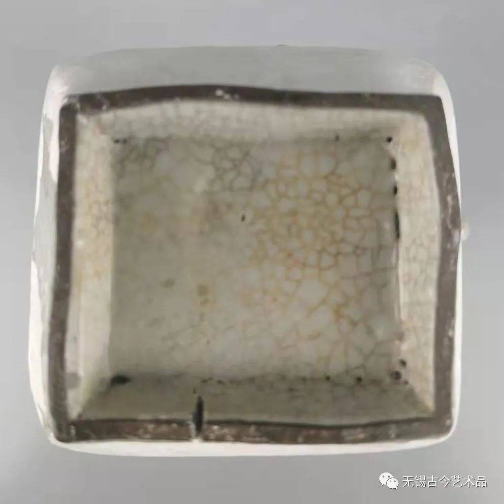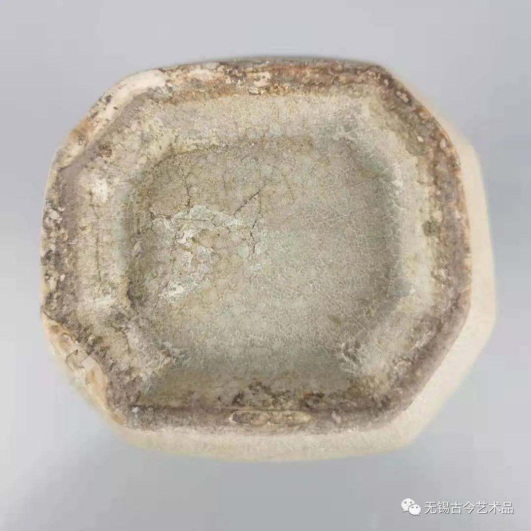 该瓶口呈六边形,束颈,有两道凸出的弦纹,左右设管状耳,垂腹六边形底足,器内外施月白有,满釉垫烧,釉面满布细开片,足端可见黄色澄泥胎,土沁较重。 3. 月白釉贯耳方瓶 尺寸:高17.8厘米